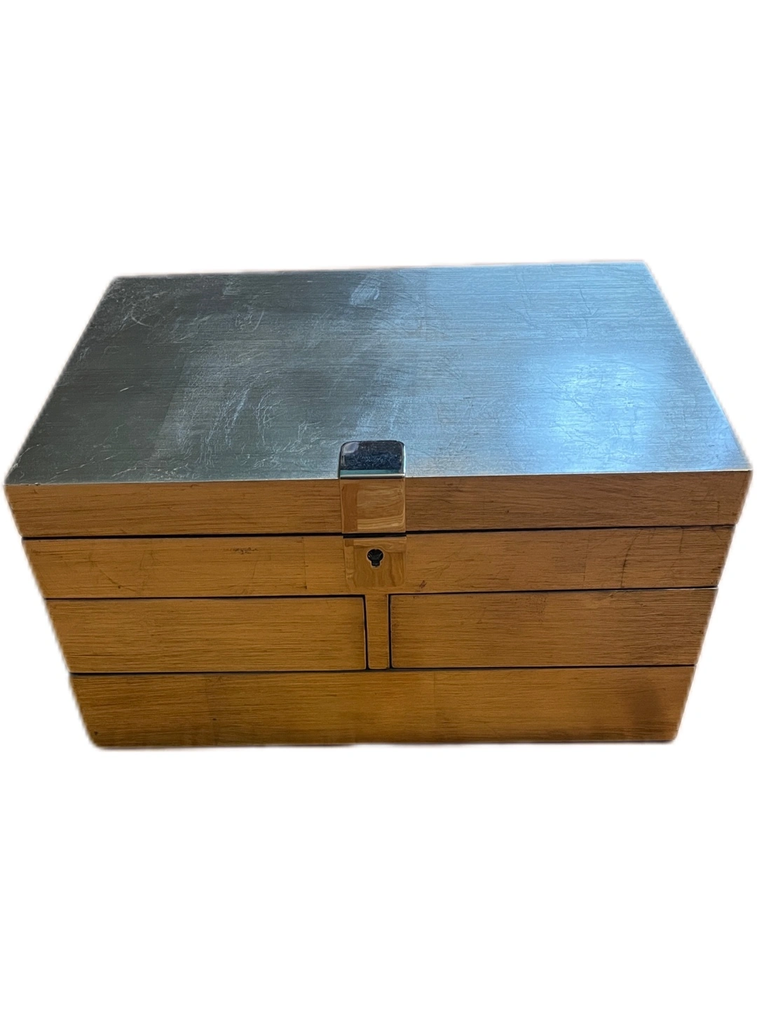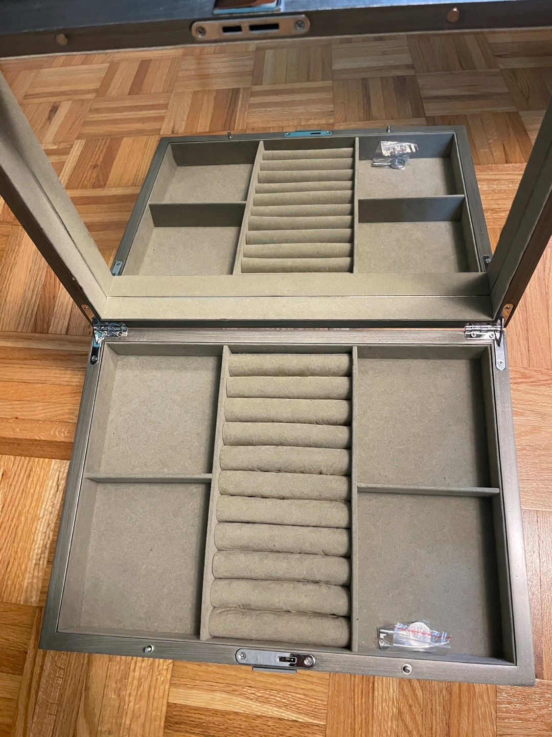 Big jewelry box from West Elm with multiple compartments. Includes a pull out drawer and a lift-up top with compartments and ring rolls. Silver finish. Can be locked, original key included.