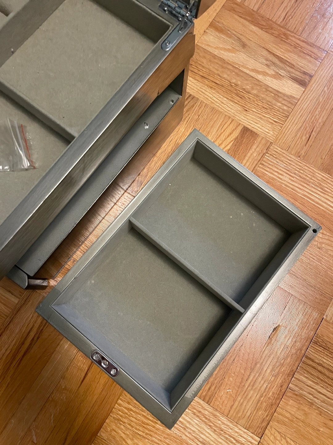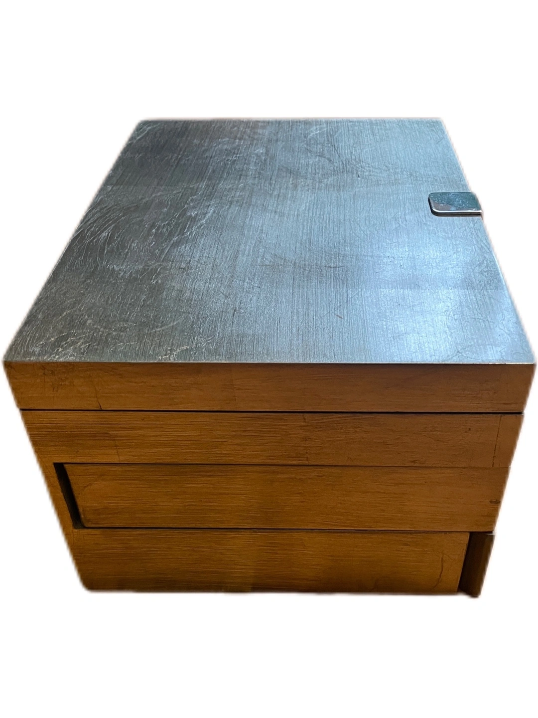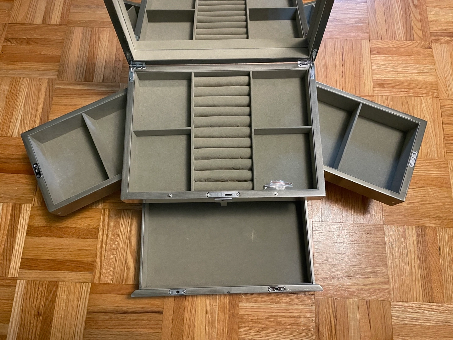 The left middle compartment has some wear to it. The swivel function doesn’t work, the entire drawer can be pulled out to use. Still functional and perfect for storing jewelry. See photos 5 & 6.