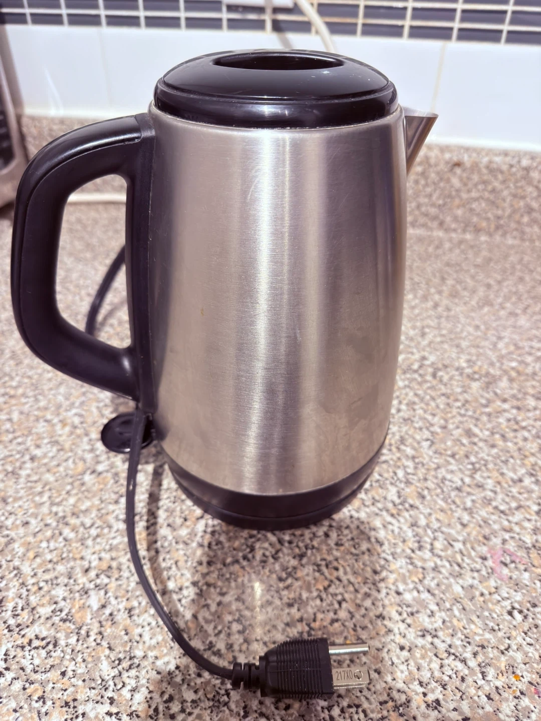 This electric kettle is made of stainless steel with a black handle and lid. It has a capacity suitable for making a few cups of tea or coffee. The base is black plastic. It's a handy appliance for any kitchen!