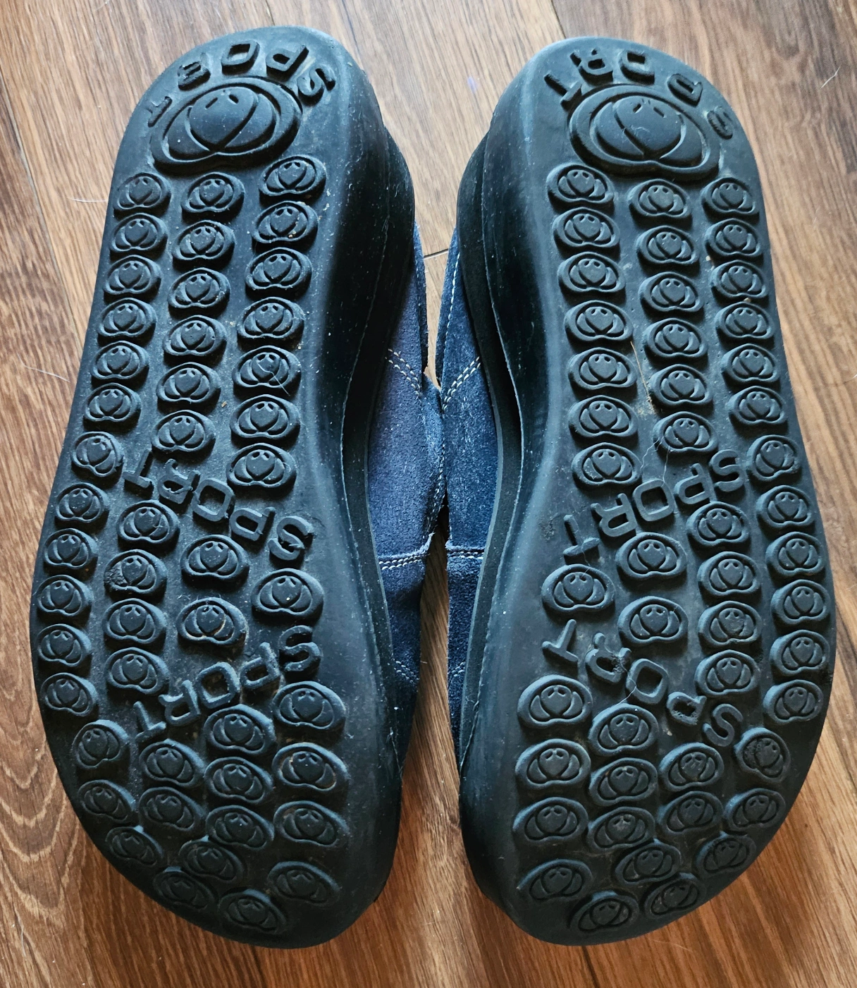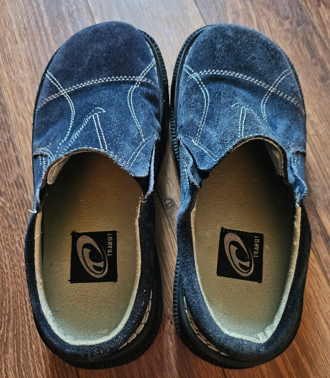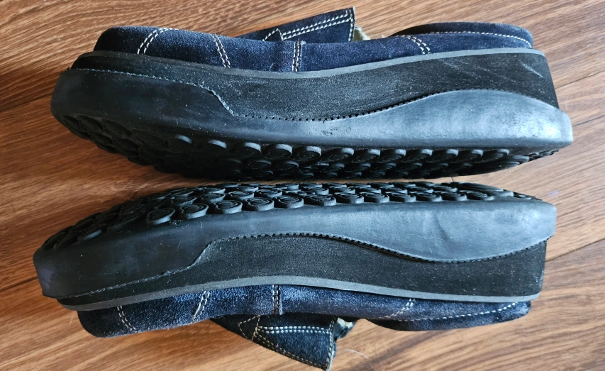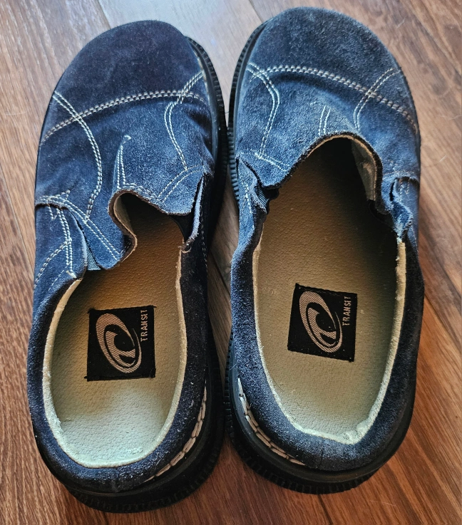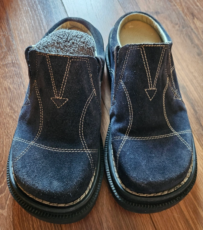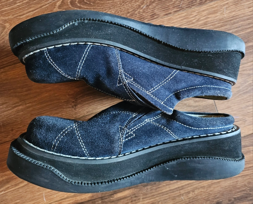 38Blue suede platform mules. Suede upper, black rubber platform sole, and a slip-on style. No laces, buckles, or other closures. Soft fleece lining.