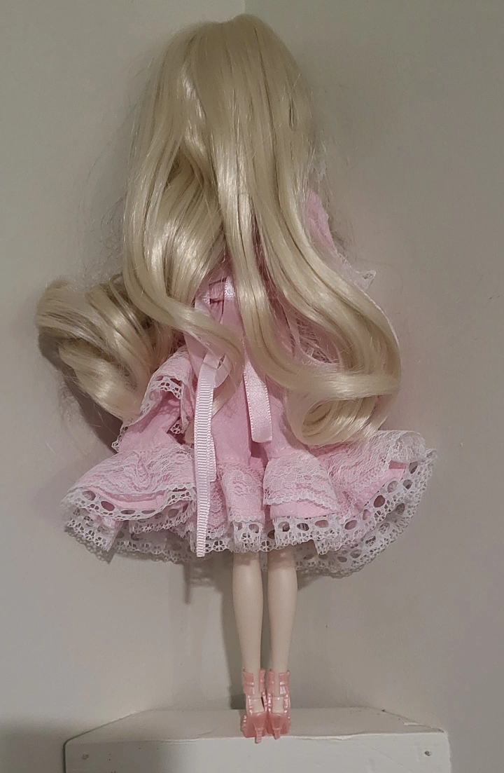 This doll is a custom doll. She wears a blonde wig and has inset glass eyes, blue colour. I must say, the pictures do not do her justice, she's extremely beautiful in person. Her face Sculpt is gorgeous. She is 30cm. You can dress her in standard barbie clothes as well.