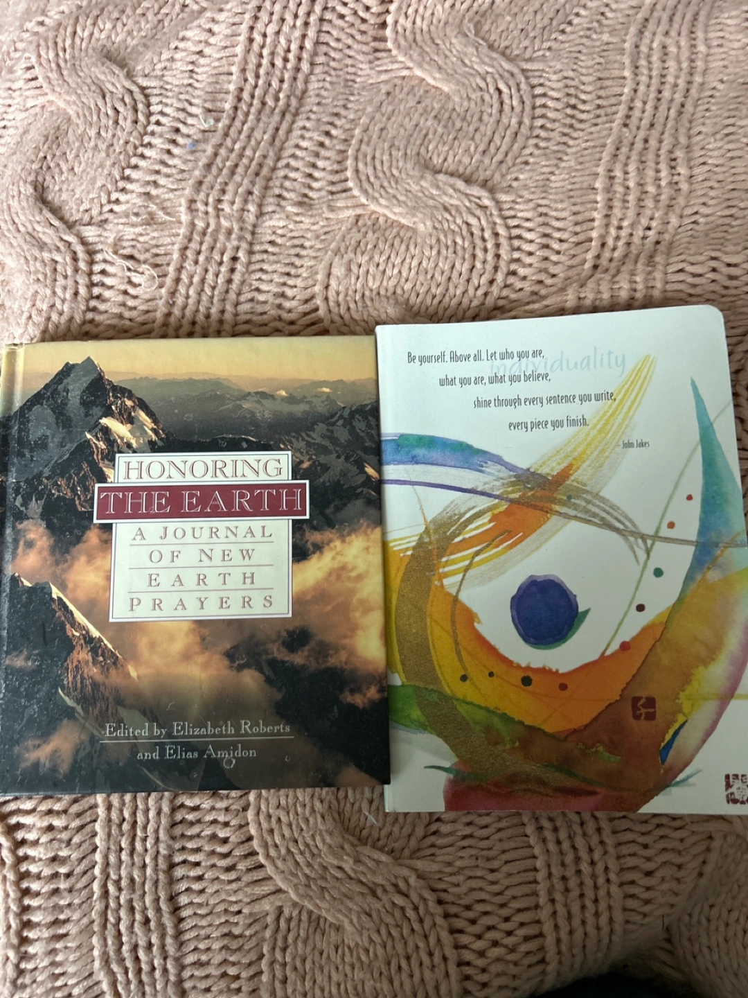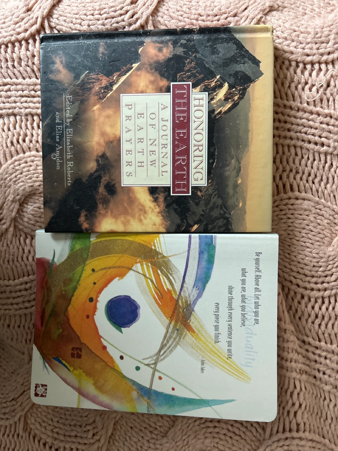 Two books: Honoring the Earth: A Journal of New Earth Prayers and a blank journal with inspirational quotes. Both books are in good condition with minimal wear and tear.