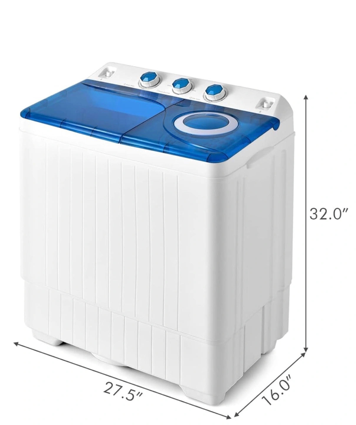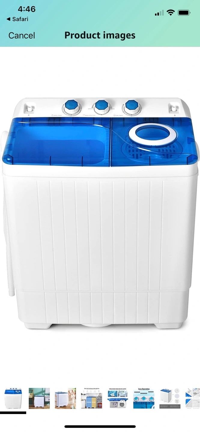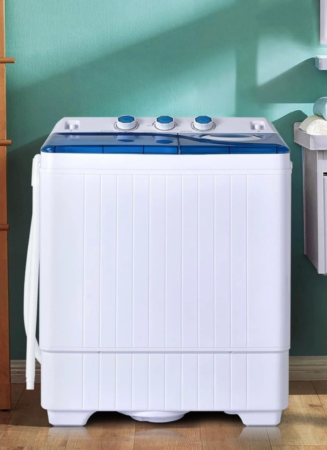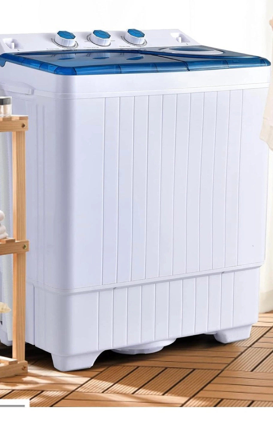 70Portable compact washing machine. White and blue colour. Includes a spin cycle. Even plastic shouldn’t be removed from it.
