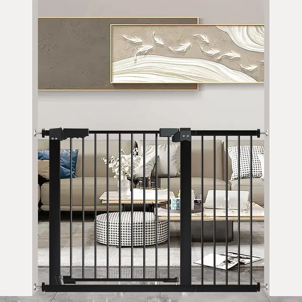 444New in box,with distressed packaging. All hardware is in a plastic bag Retails for $120 +taxes . Measures 53.94 - 57.87 inches. black. 180 ° Two-way Automatic】Our walk through baby gate has a 180 ° two-way opening design, which allows you to open in both directions for easy entry and exit.And pressure mounted baby gate will closes automatically when handle released, open from both sides. You can open and close this large baby gates with one hand for easy passage. 【Durable and Safety】White metal long baby gate is made of thick double carbon steel pipe,0.047"thick outer frame steel + 0.47" diameter thick reinforced round pipe,make a safe protective baby gate. The spacing between the round tubes is only 1.77 ",so it is also a perfect choice as a pet gate, which can effectively restrict the entry and exit of pets. After manual testing, the toddler gate for door can withstand 180 pounds of pull. 【Multi Use】Because of the multiple size extensions and adjustable designed bolts, our 30.7" height tall extra wide pressure mounted gate width can be adjusted from 53.94" to 57.87". Toddler safety gate for stairs, doorways and Hallways to stop babies,children or pets from climbing over.