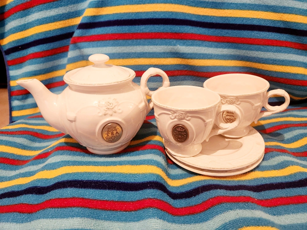 Cottage Style Teapot and Cups Set White teapot and two cups, ornate design with silver accents. Teapot has a matching cups and saucer.
