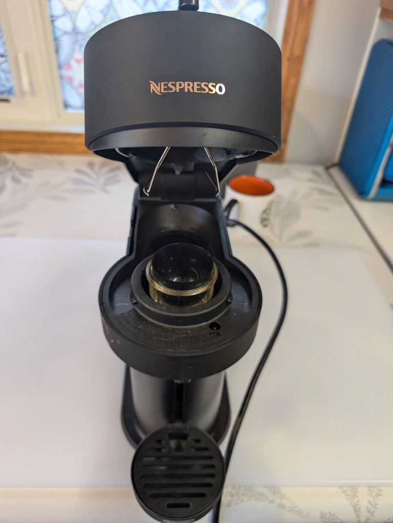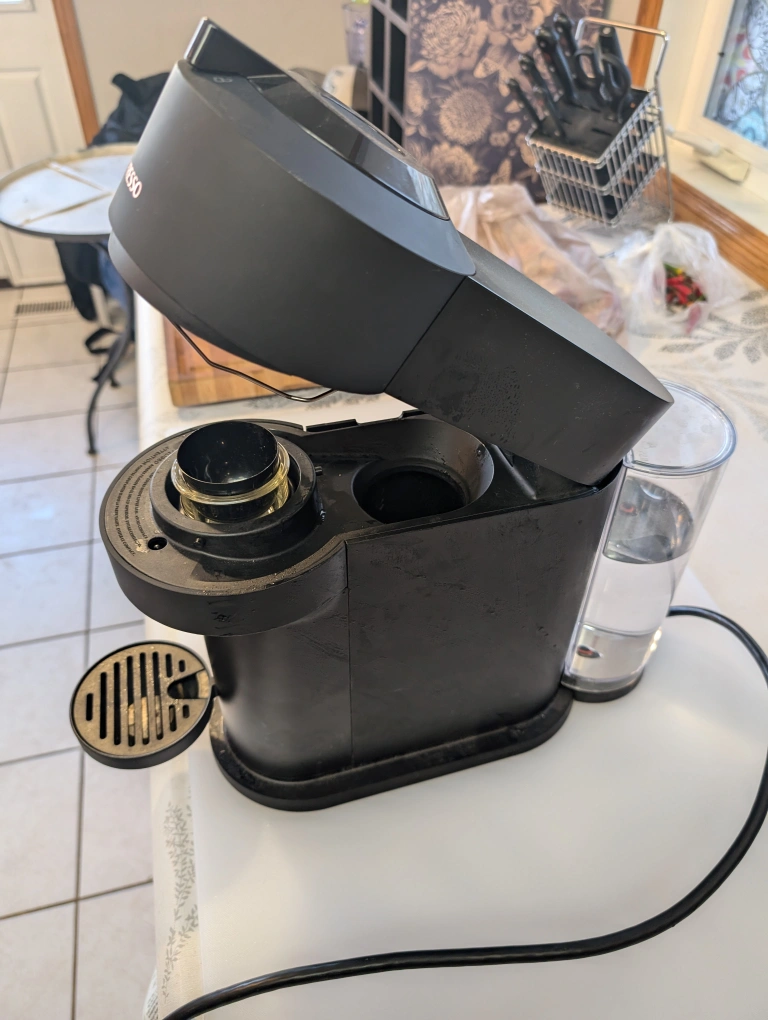 Black Nespresso VertuoPlus coffee machine. Used, but in good condition. Includes a water tank, pod holder, and drip tray.