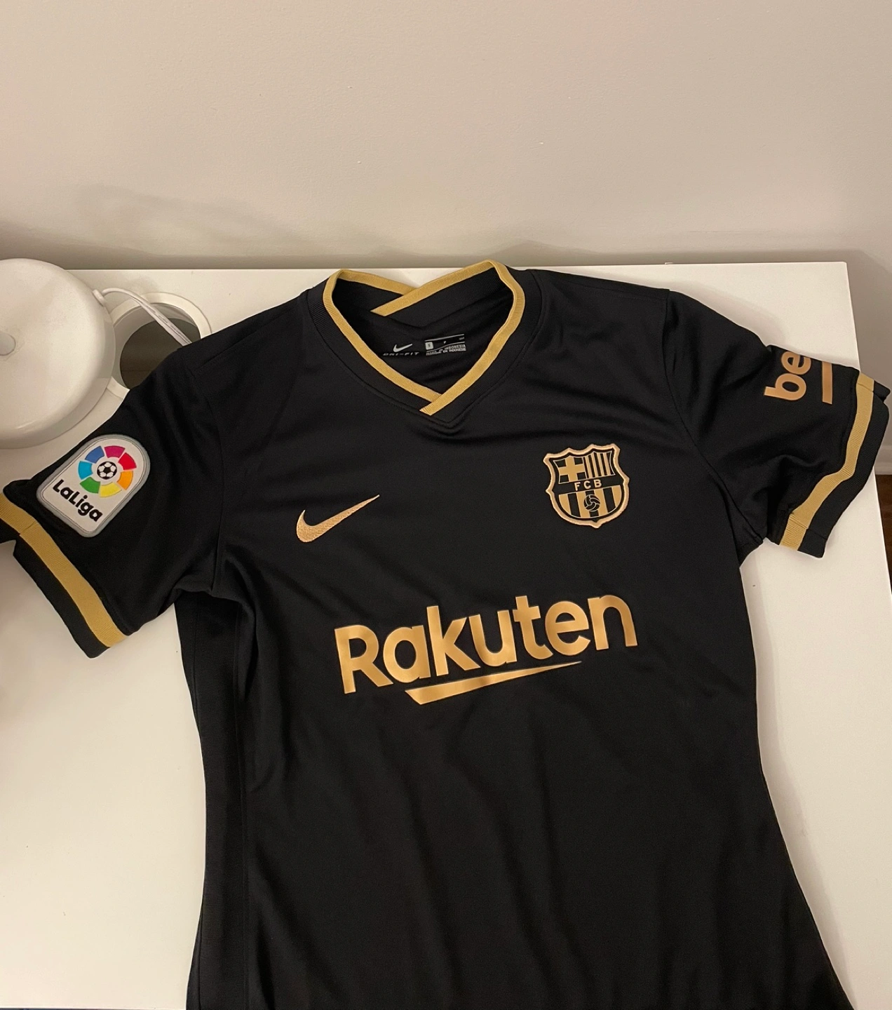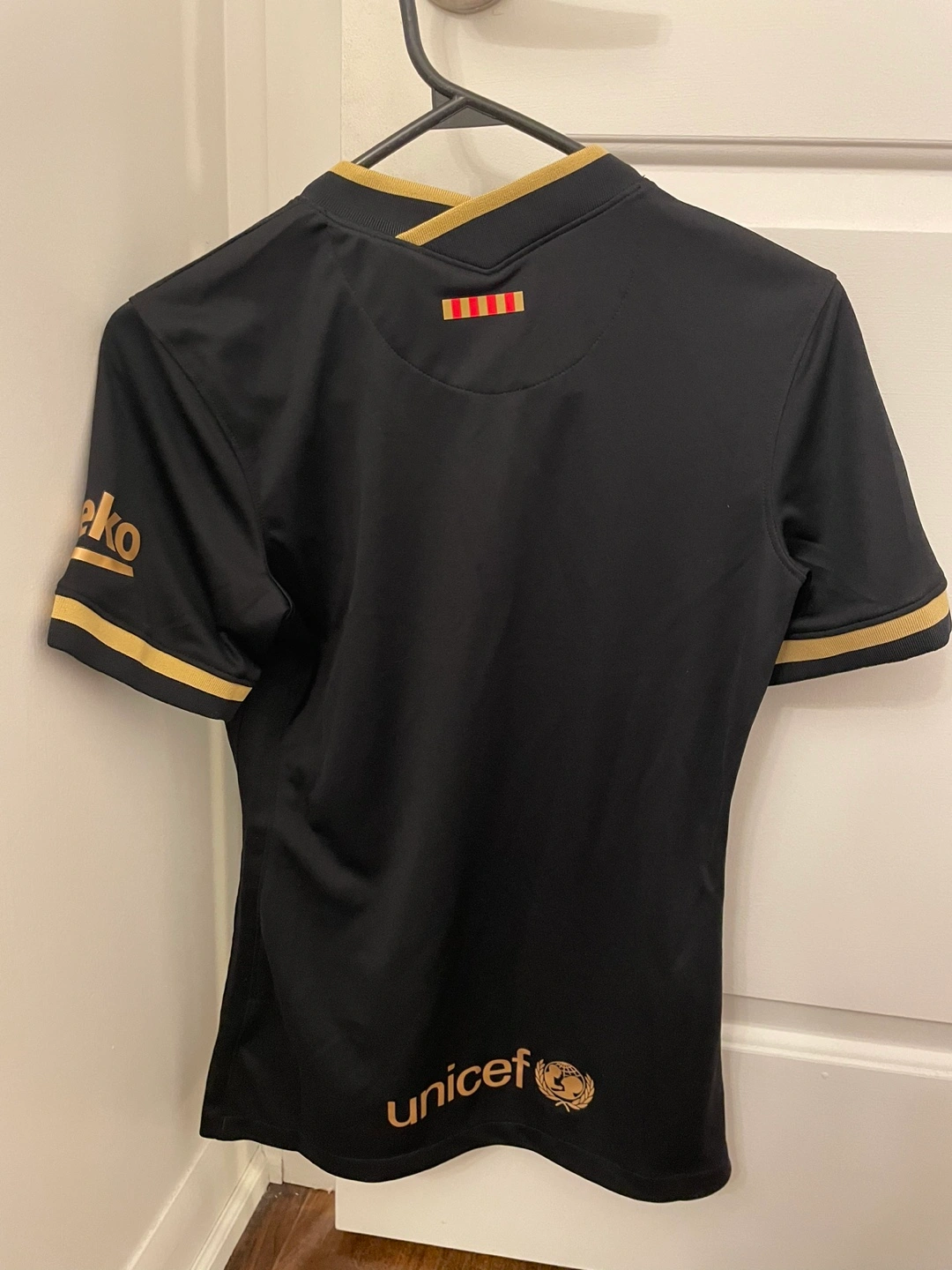 262Black and gold FC Barcelona jersey, size medium. Features the Rakuten sponsorship and the UNICEF logo.