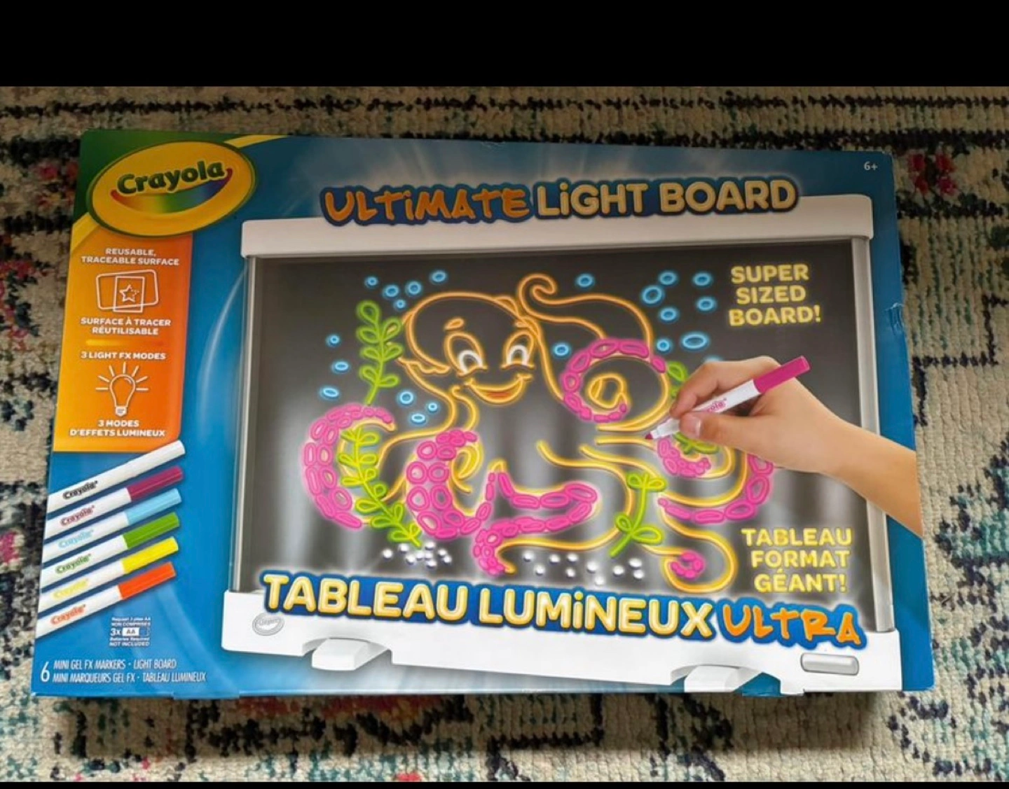 Put your art in lights! With the Crayola Ultimate Light Board you can create amazing art and display it in a big, bold way. Just draw your masterpiece directly on to the Light Board surface and turn it on. Watch your designs shine! The bright LEDs built into the frame make the inks from the included Gel FX Markers really glow! The removable back panel makes tracing images a snap. And when you're ready, just wipe the screen clean for unlimited creativity. The built-in markers storage makes it the perfect option for on-the-go creativity. Includes the Ultimate Light Board unit and 6 Gel FX Markers. Batteries not included.
