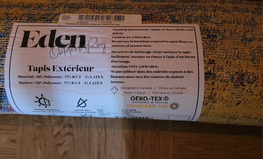 Outdoor rug in blue, yellow, and grey. Made of polyester.