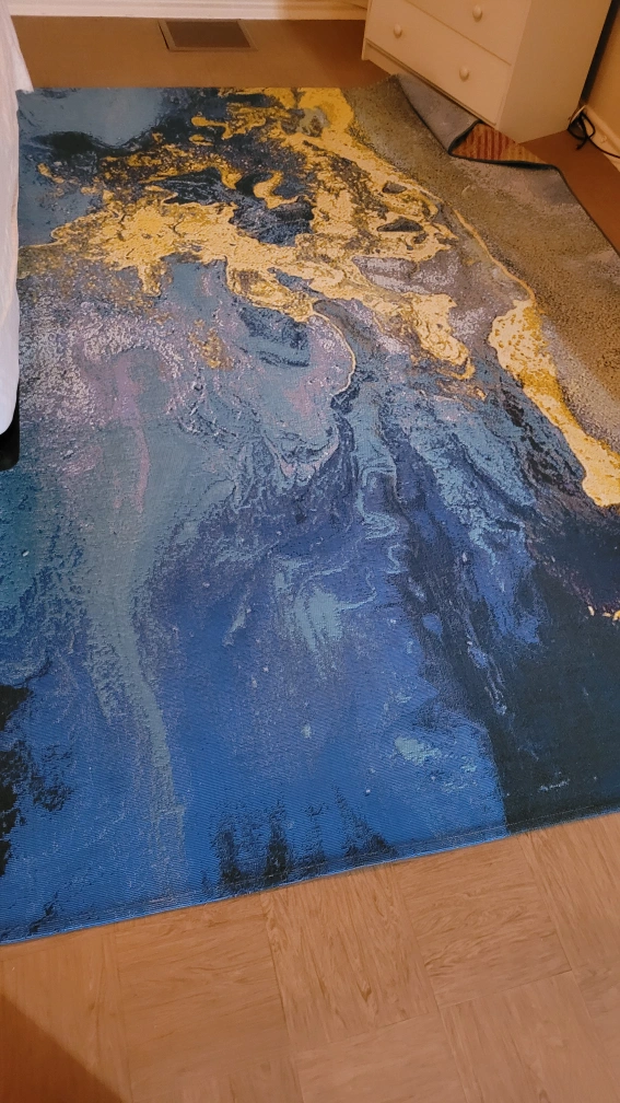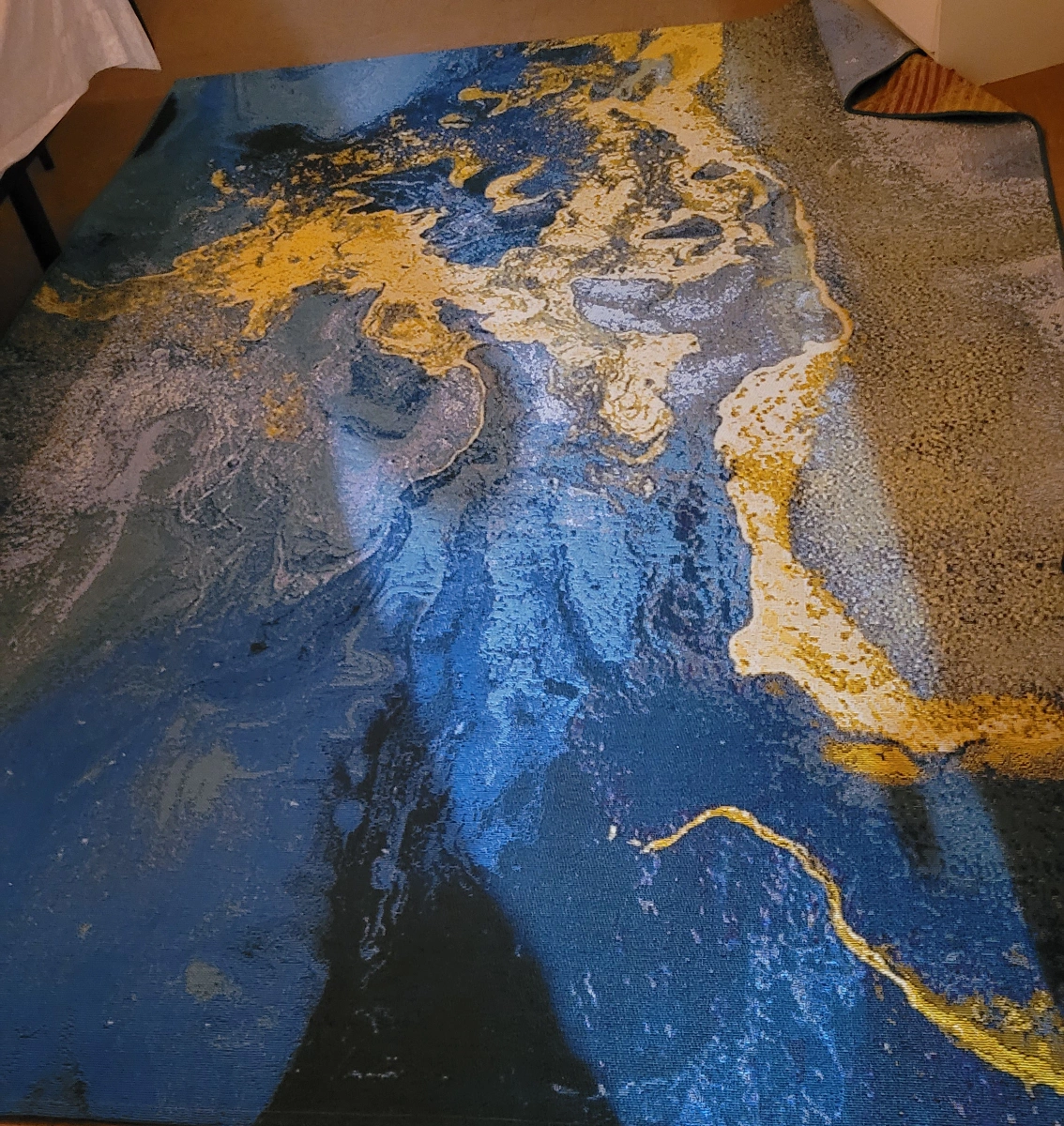 Outdoor rug in blue, yellow, and grey. Made of polyester.