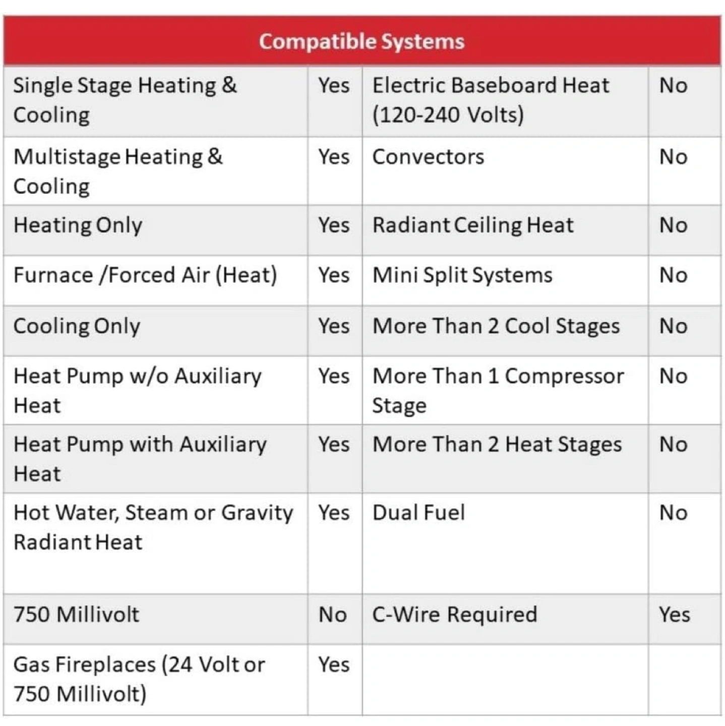 COMPATIBLE WITH: Forced air (gas, oil or electric), hot water and steam, and heat pumps with electric backup. Does NOT work with electric baseboard heat (120-240V). C-Wire required.