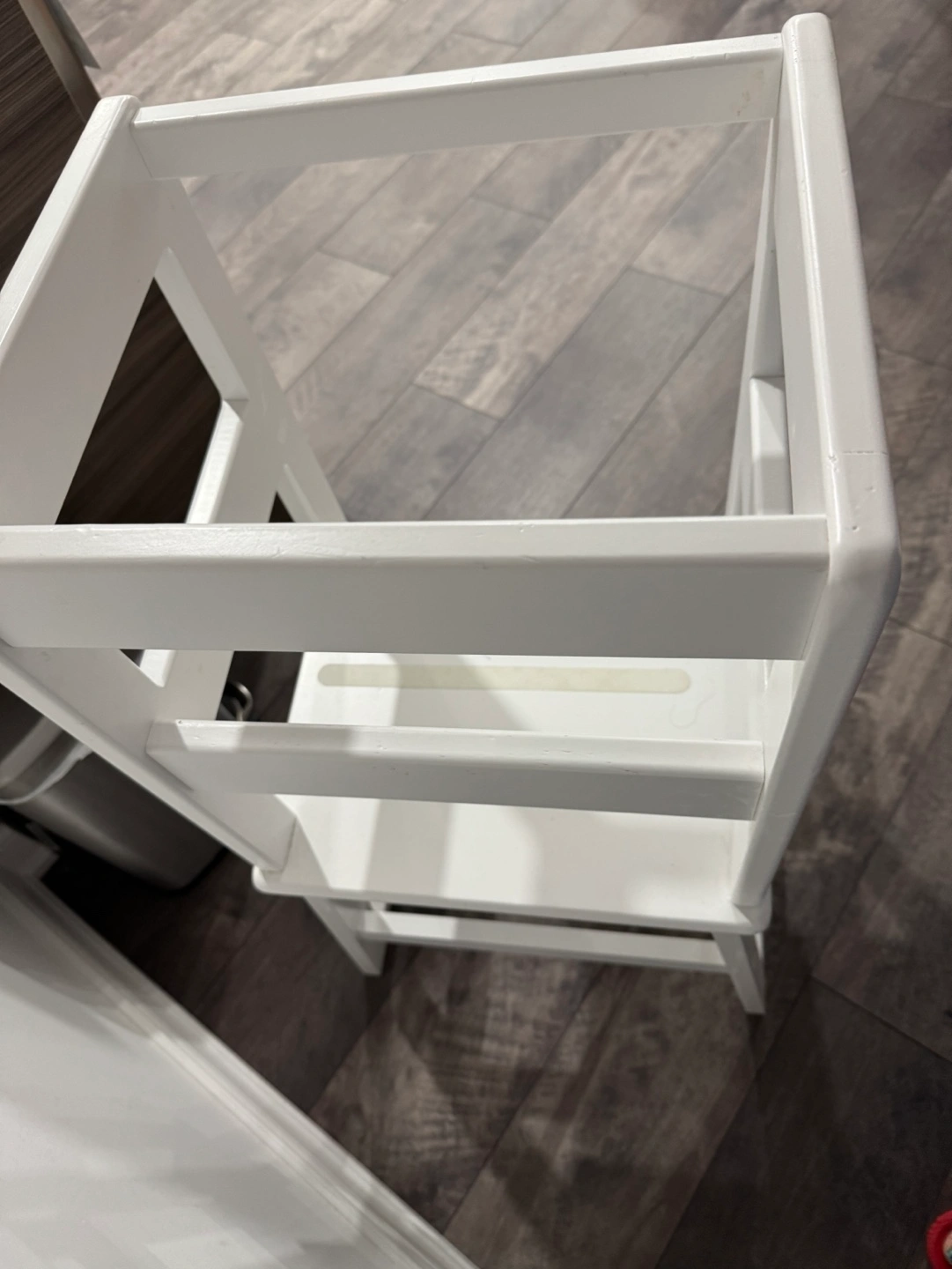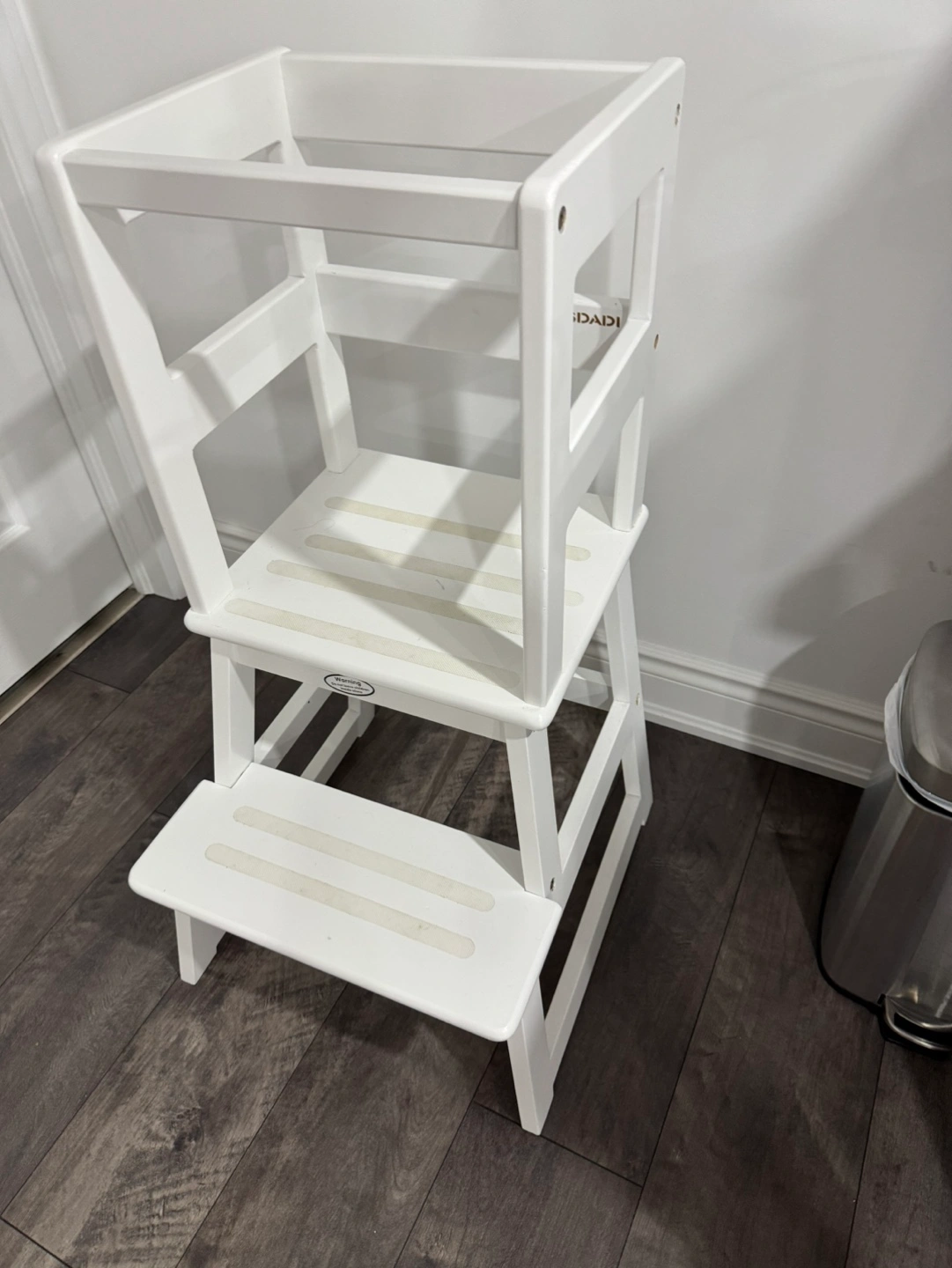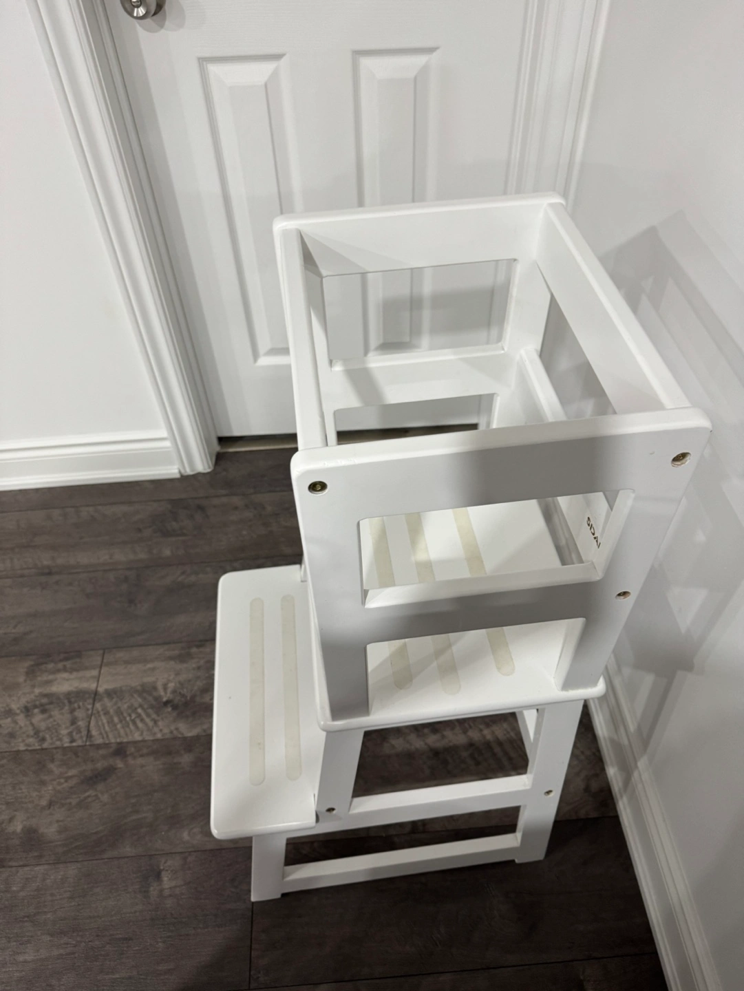 White toddlers tower with non-slip treads. Great for toddlers and young children to reach higher surfaces. Stable and well-made.