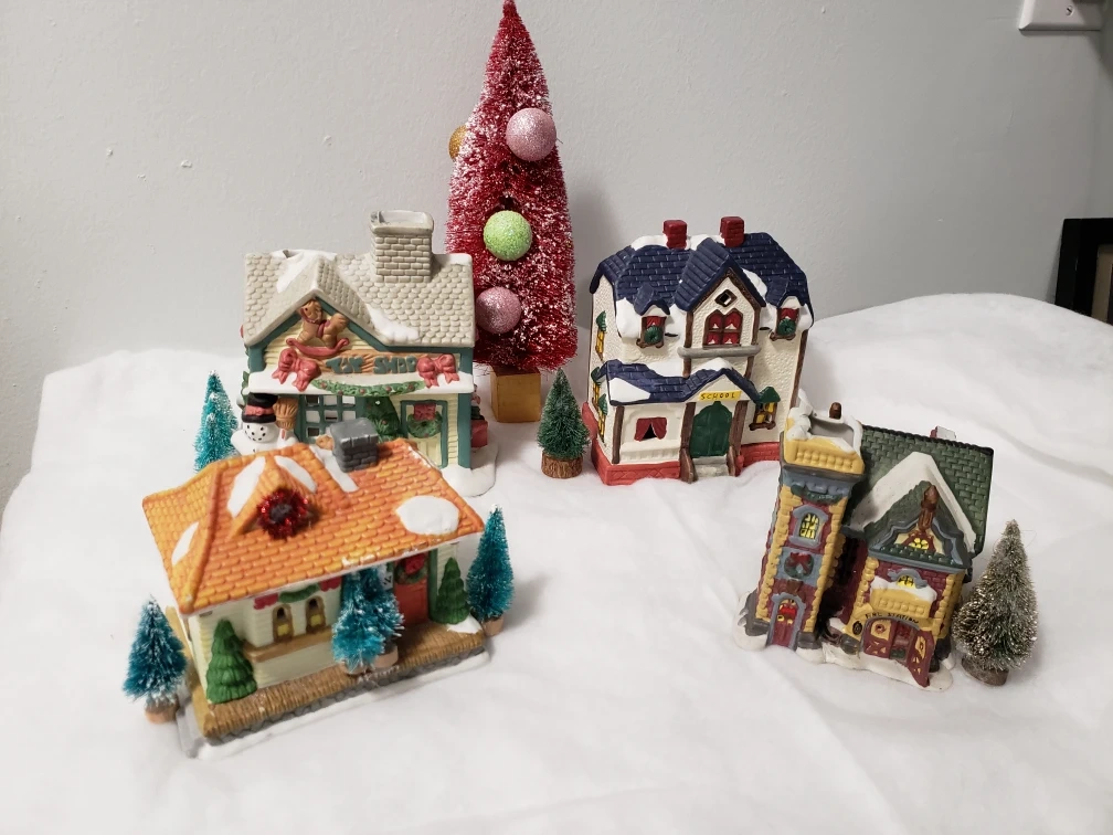Set of 4 Christmas village houses. Includes a schoolhouse, a toy shop, a house, and a fire station. Trees included except red tree