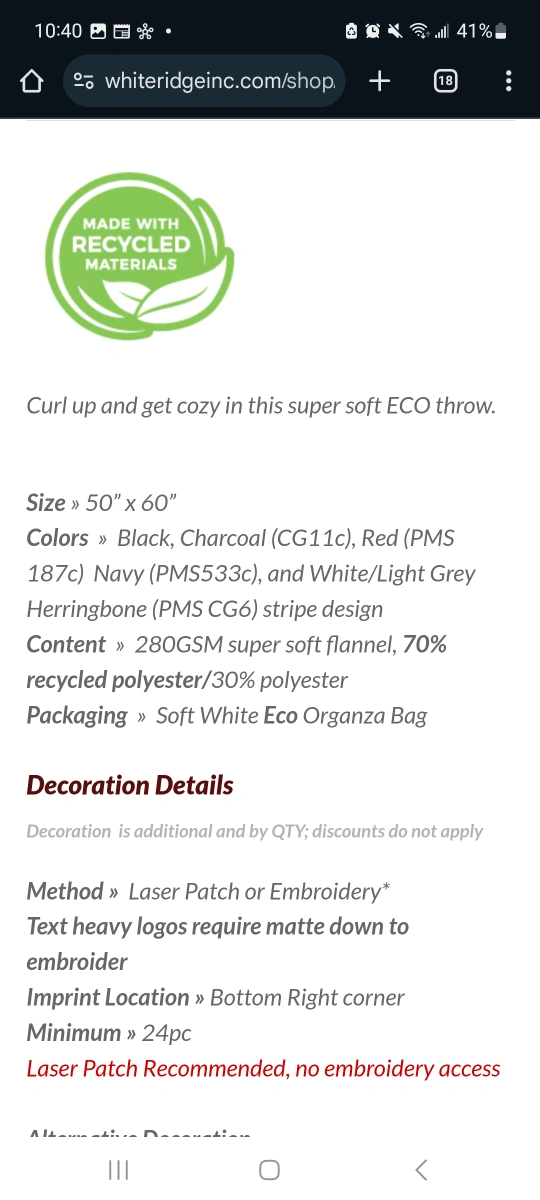 1000+Brand New got it as a secret santa game. Have a ton of blankets. Super soft ECO throw, Black, made with 70% recycled polyester/30% polyester. https://www.whiteridgeinc.com/shop/browse/eco-78/product/eco-serenity-throw-390/