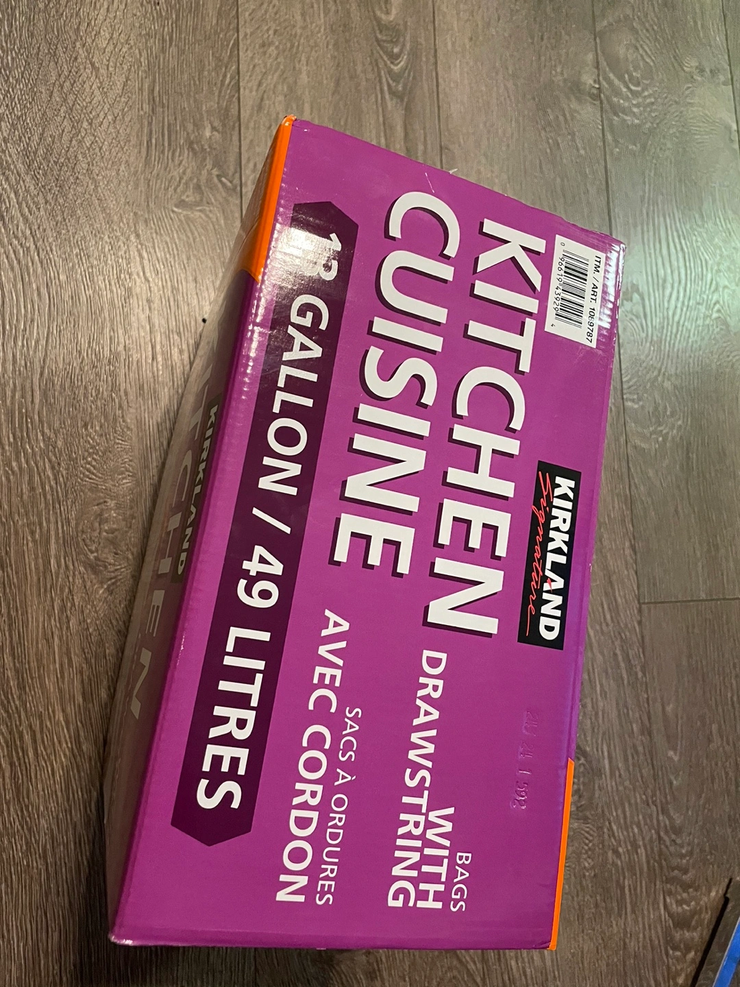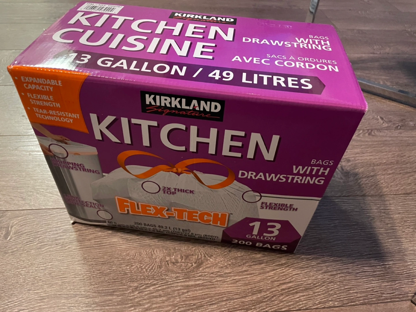 New, unopened box of 200 Kirkland Signature 13 gallon kitchen garbage bags with drawstring. Flexible, tear-resistant technology.