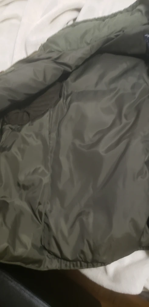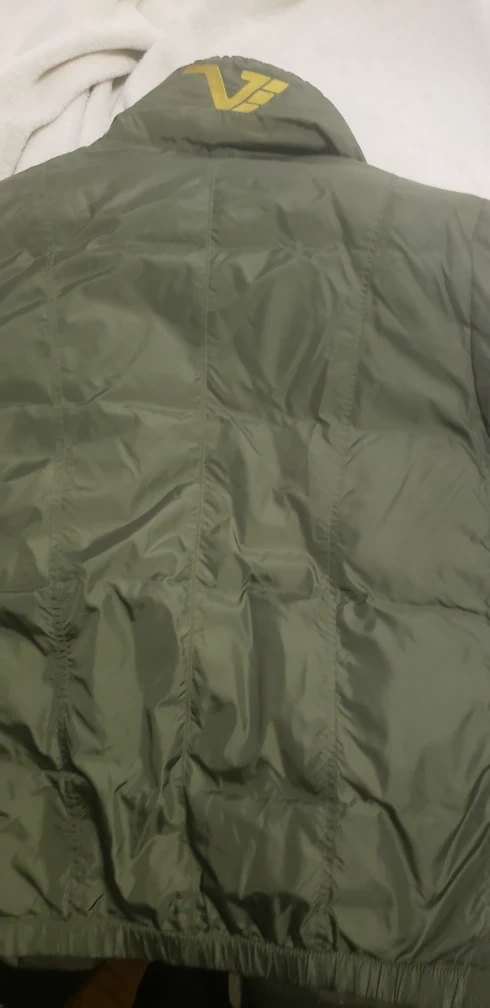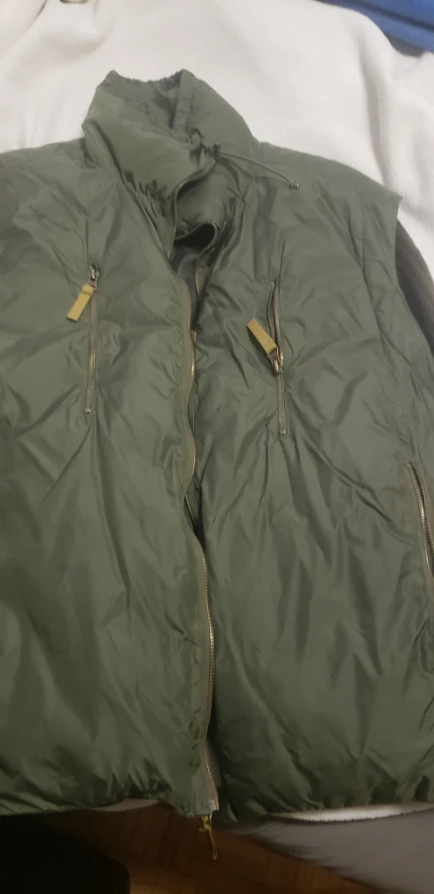 Green puffer jaket with a zipper closure and a stand-up collar. Has four zippered pockets on the front. Knit sleeves. 70% down, 30% feathers. Warm and very light. Very good condition