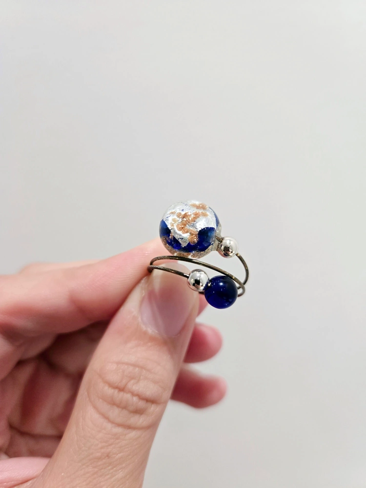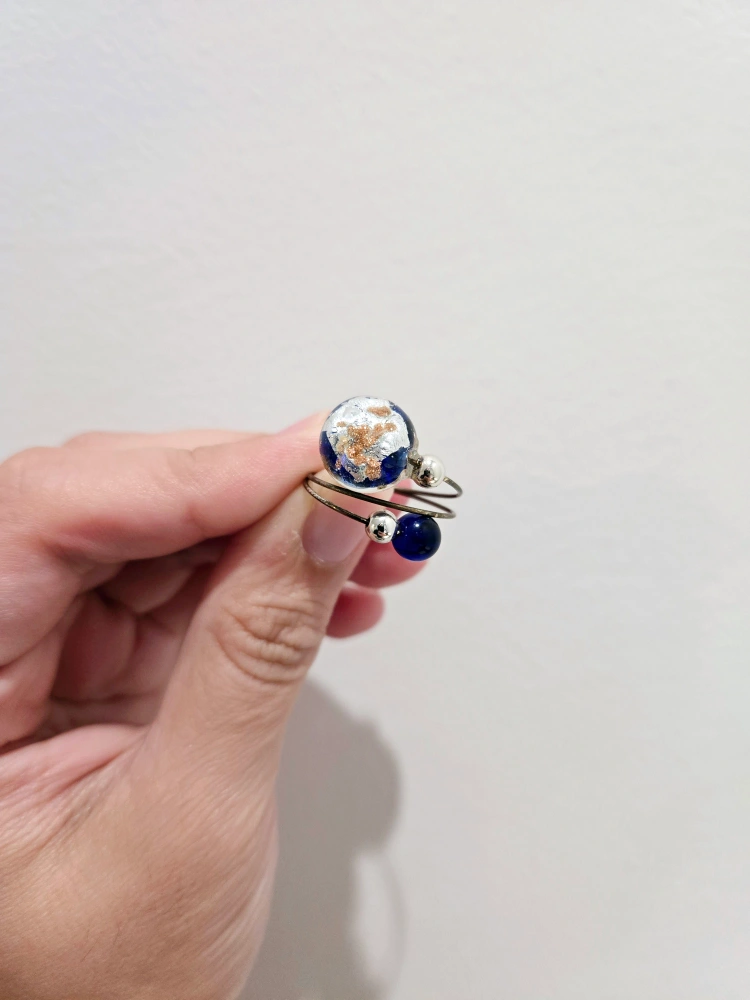 Adjustable ring featuring a blue and gold glass bead with smaller blue glass beads on a wire setting.