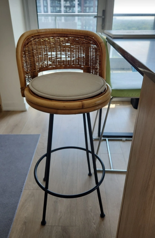 Purchased these antique bar stools for $1000+. They are absolutely gorgeous with a rattan frame and black metal base. The stools have removable cushions. The chairs swivel as well 360 degrees. Very easy to clean and move around!