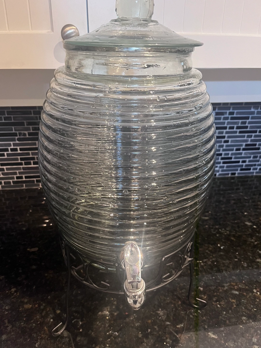 80Glass beverage dispenser with a metal stand and a tap. Has a lid.