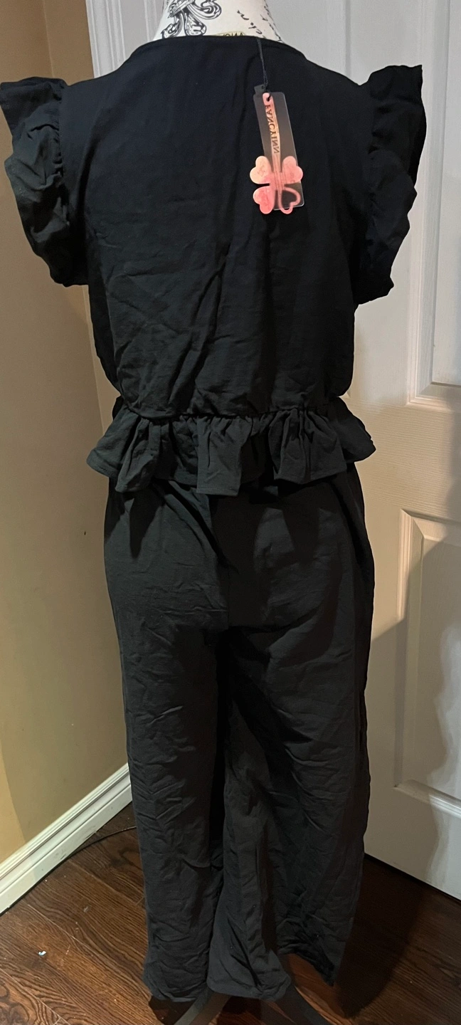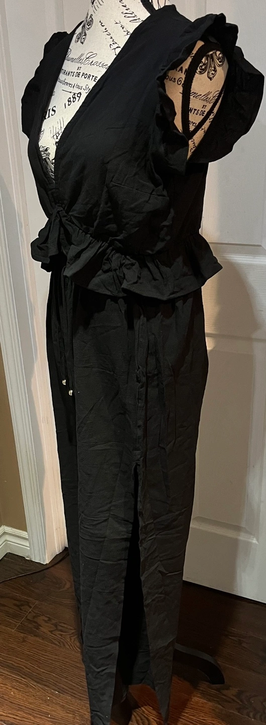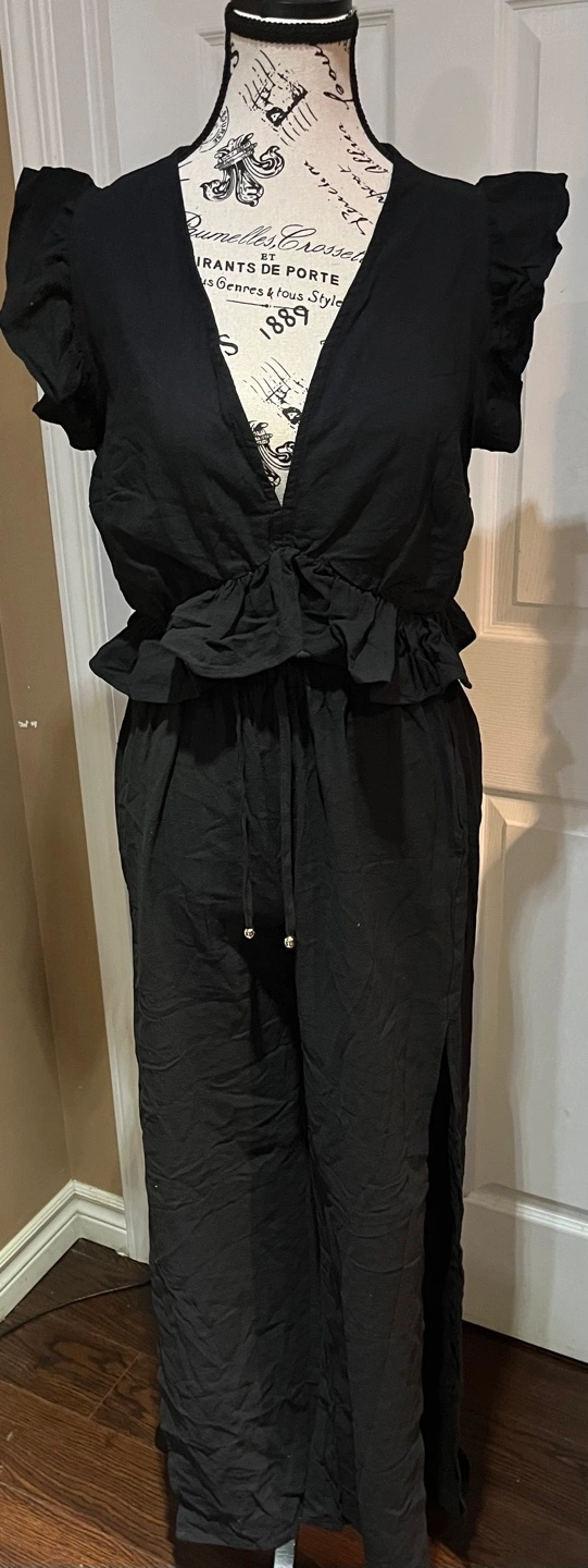 Black crop top with ruffle detail and matching pants. The pants have a drawstring waist and are wide leg with slit. The top has a deep V-neckline.