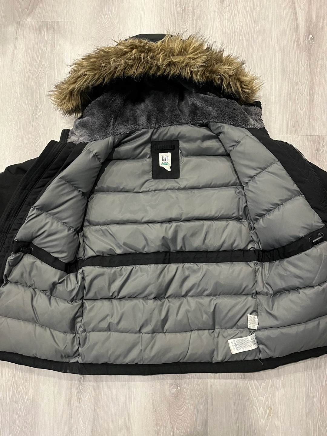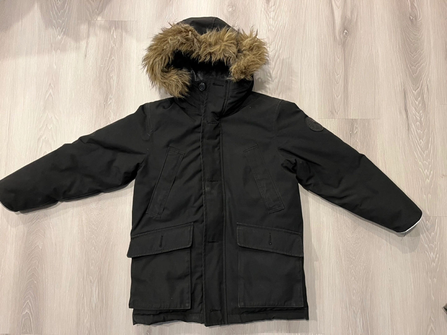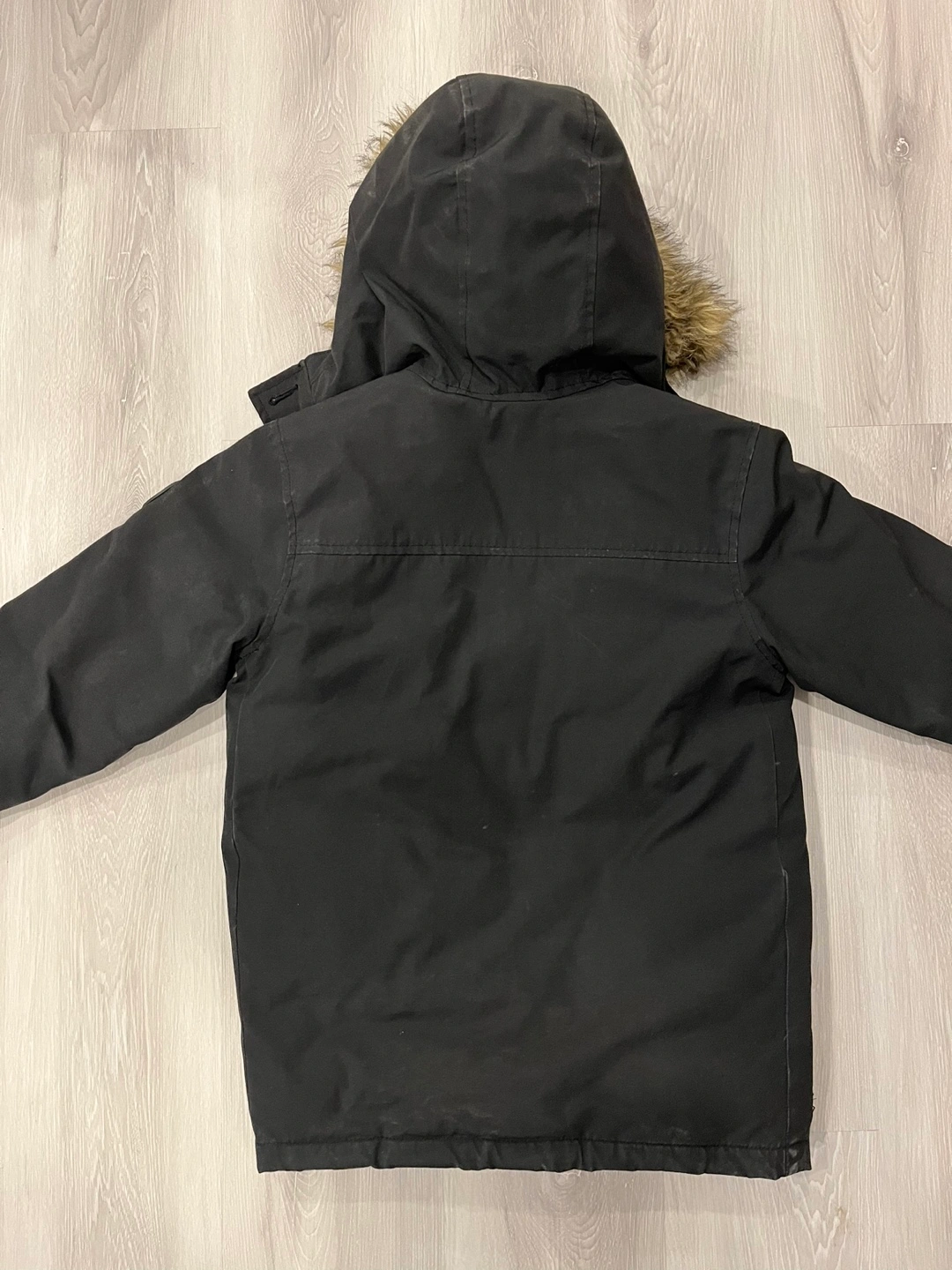 Smoke free pet free home Pick up only. Yonge & Steeles Item brought to driveway Size medium around 8T unisex black Black winter jacket with fur-lined hood. Has multiple pockets and a zip-up front closure. Warm and cozy, great for cold weather.