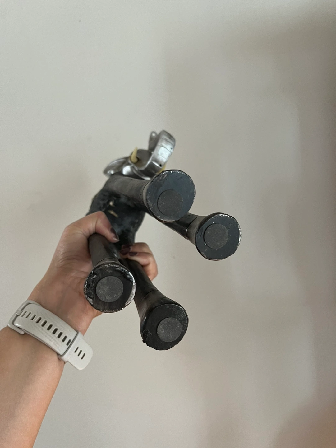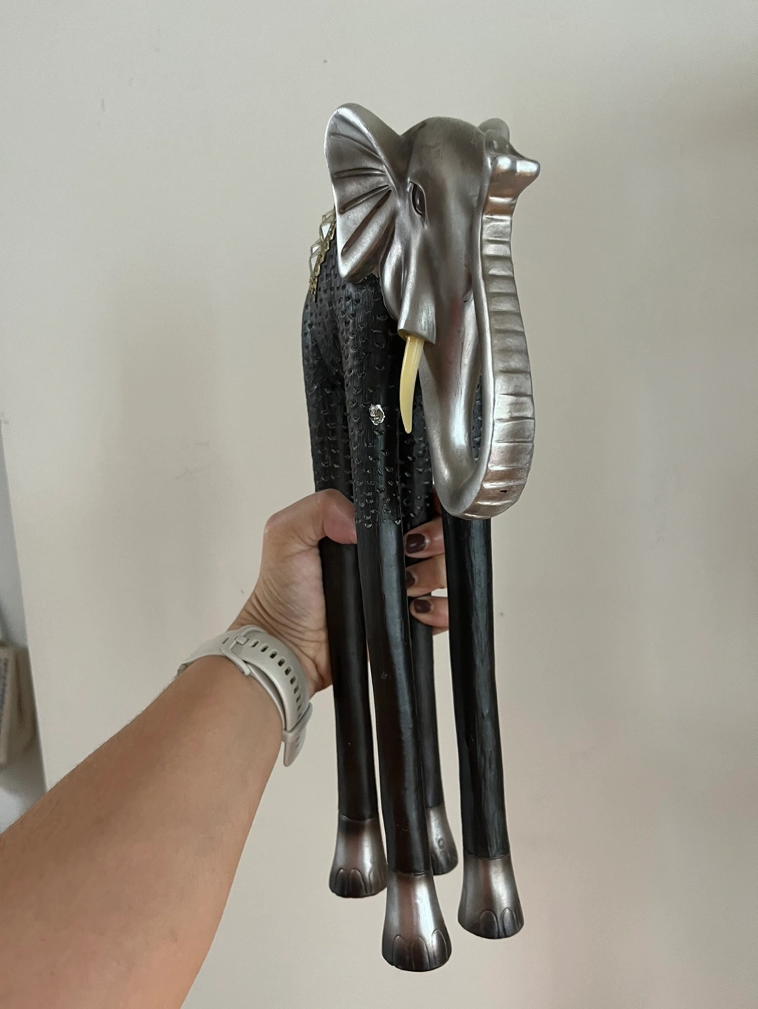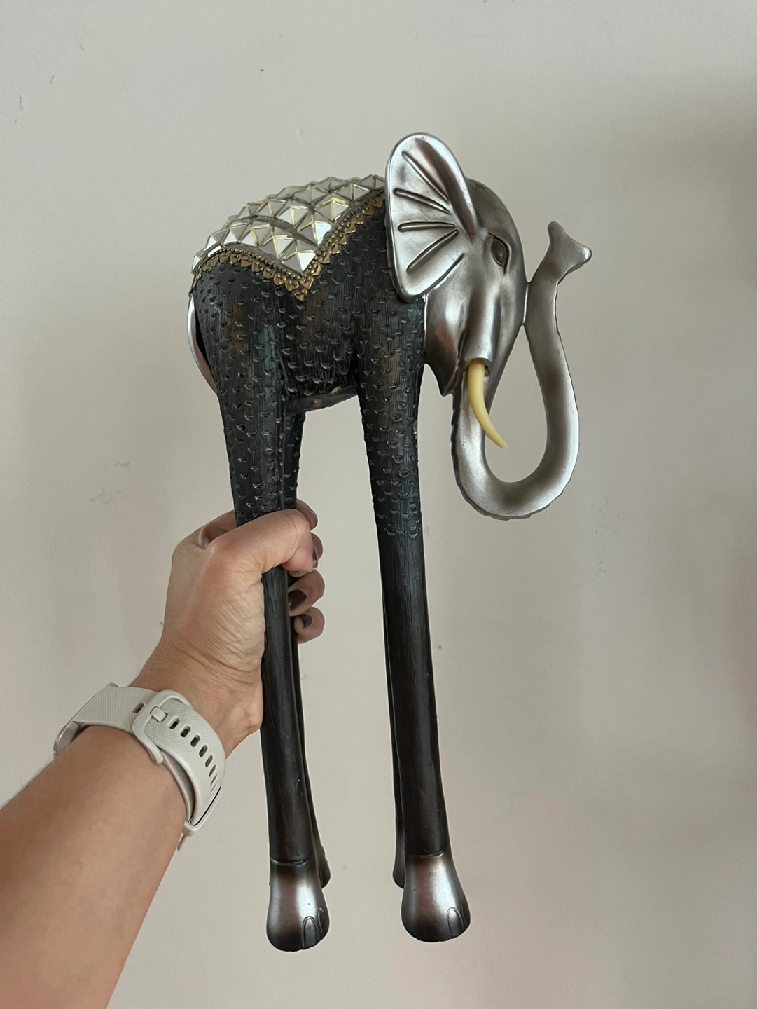 Tall silver and black elephant statue. Has a decorative design on its back. The legs are long and slender, made of wood.