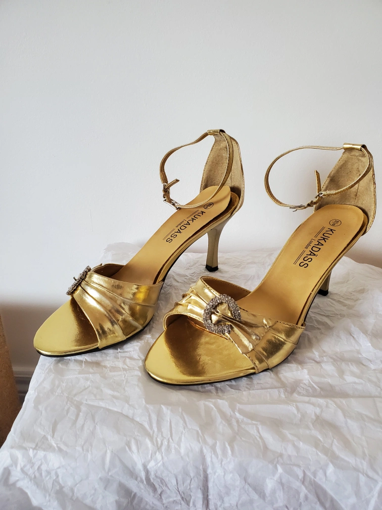 Gold 3" Heeled Shoe with a rhinestone detail and ankle strap. Size 6.