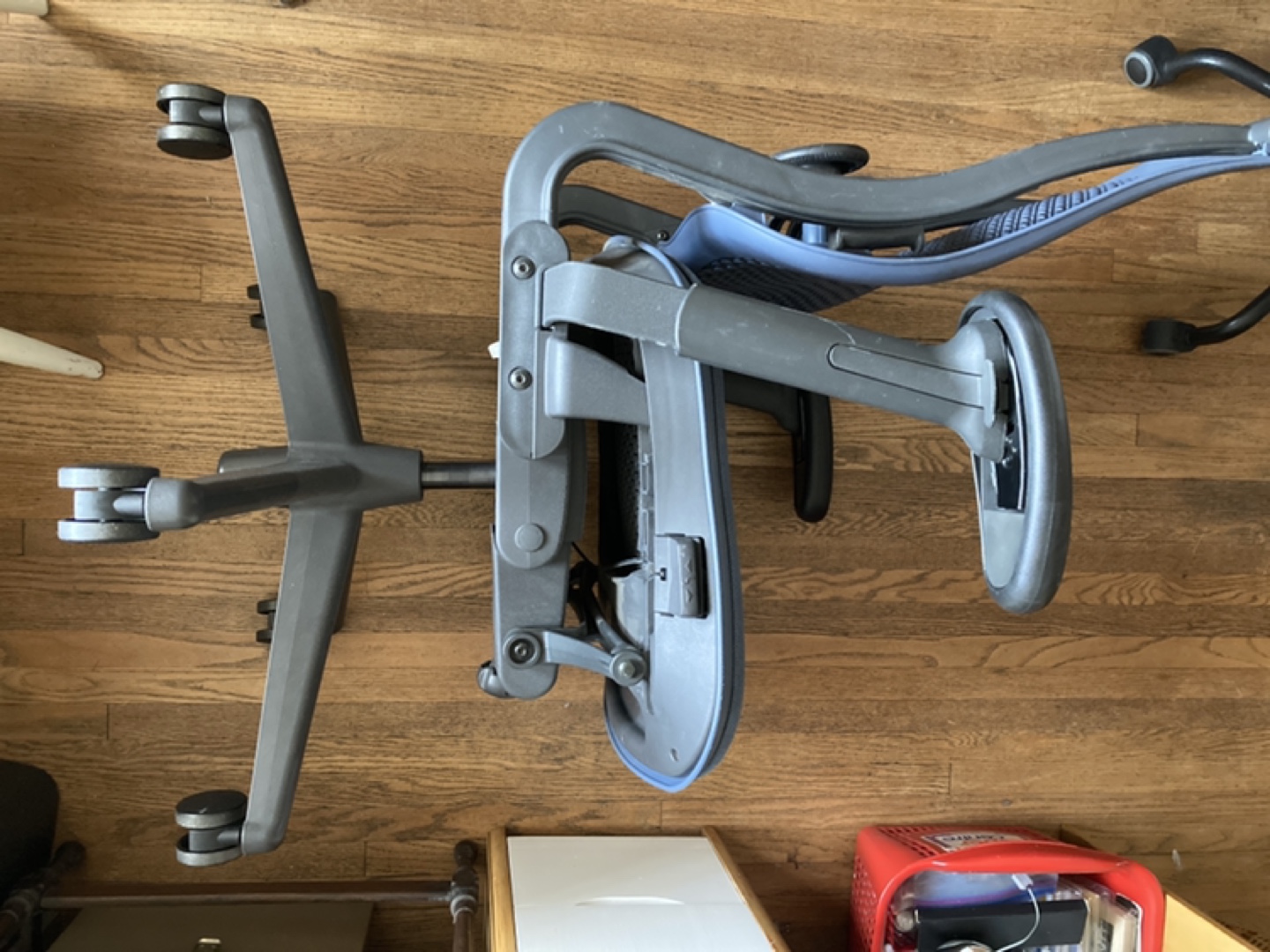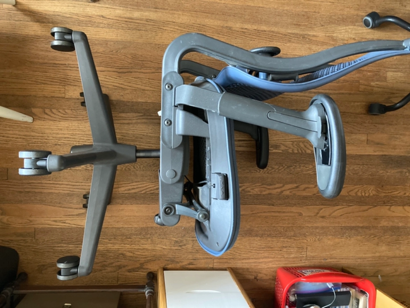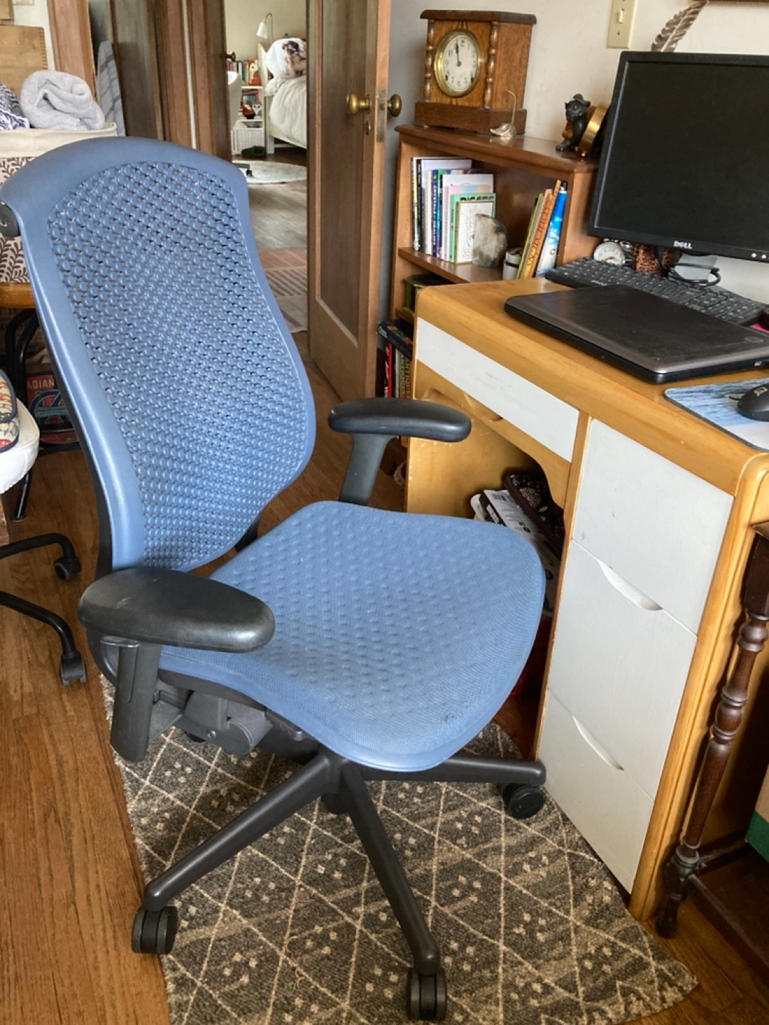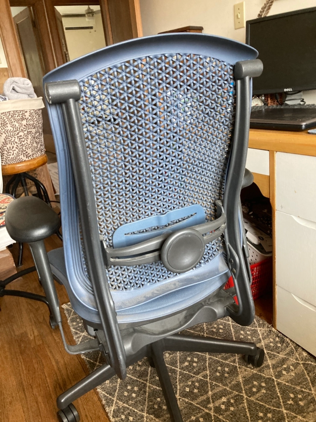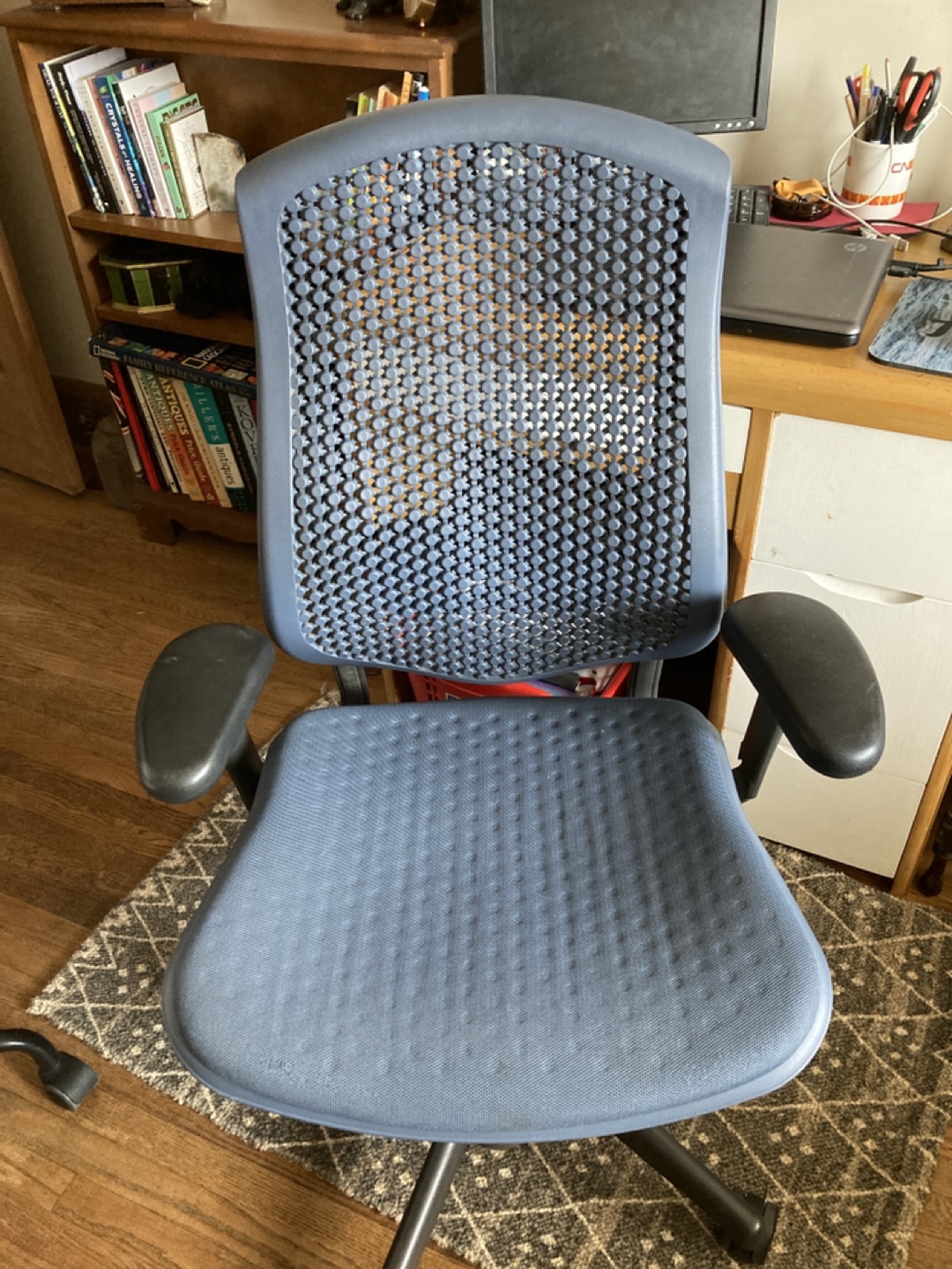 Blue mesh office chair with adjustable features, including height and armrests. Has wheels and a swivel base. Shows minor wear and tear but is in good condition.