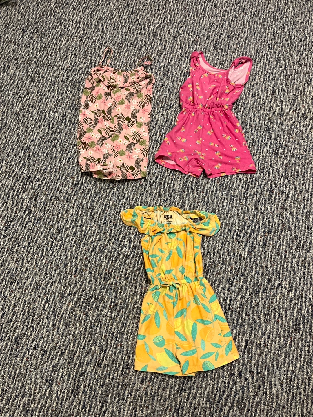 Three girls' jumpsuits. One is pink with pineapples, one is pink with palm trees, and one is yellow with lemons. Take all for $20