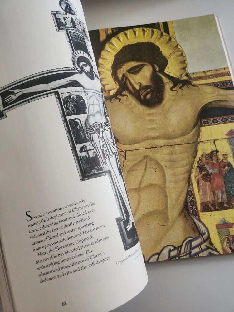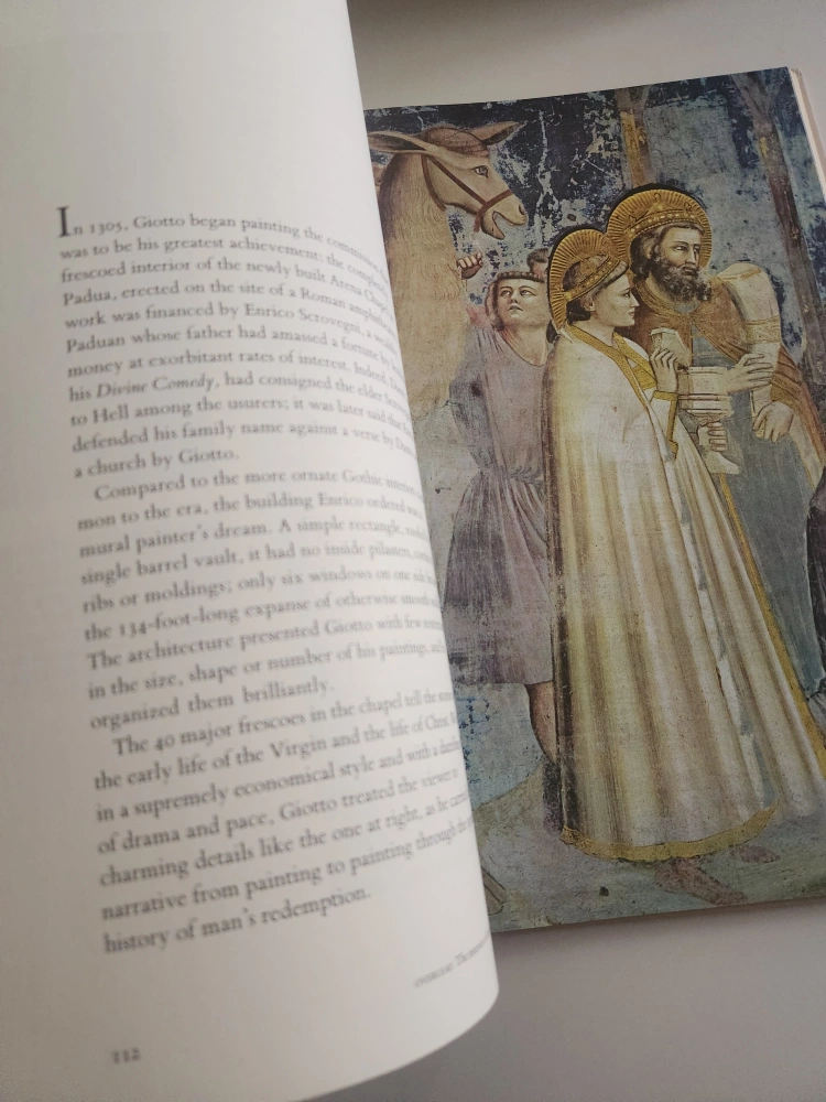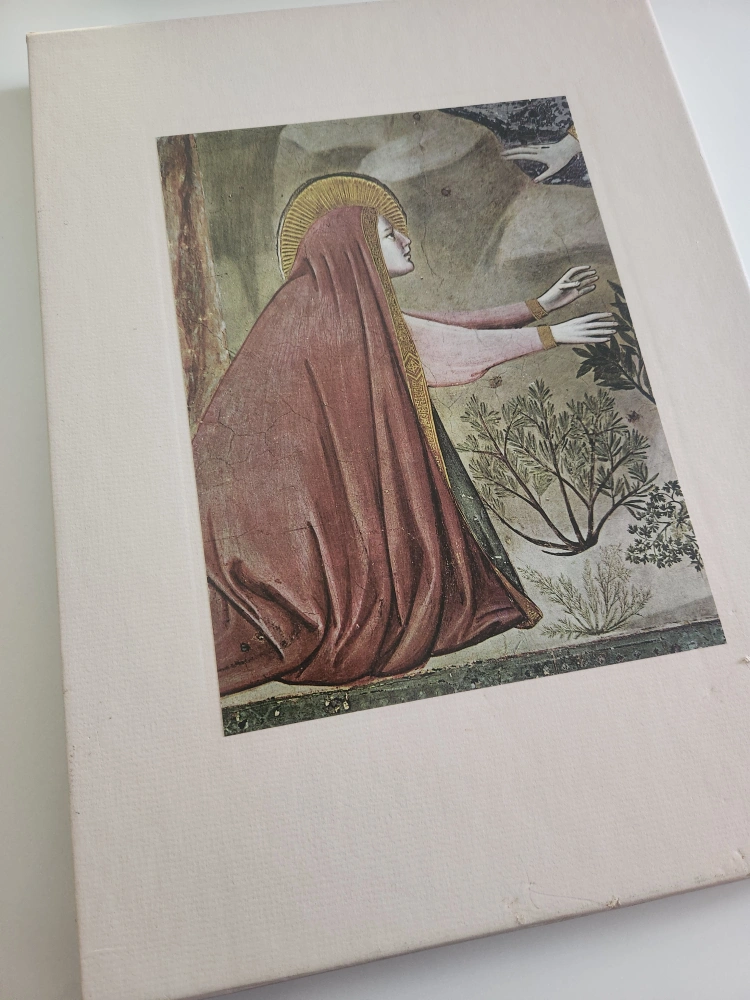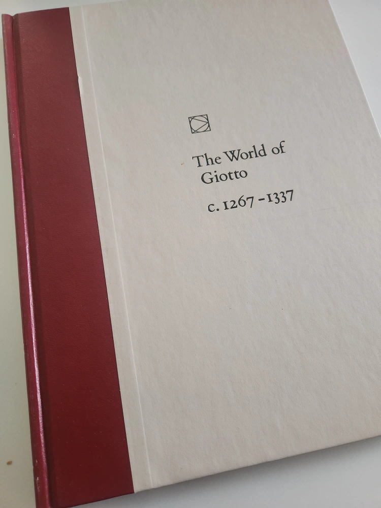 Hardback book, includes many images and text about the artist Giotto. There are images of his works and text describing them. 1971