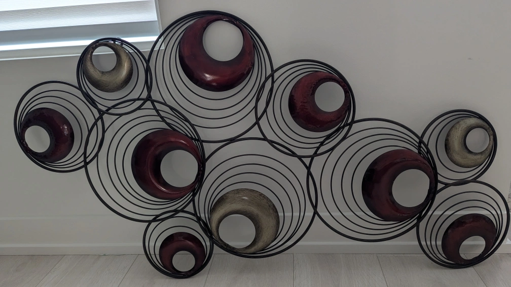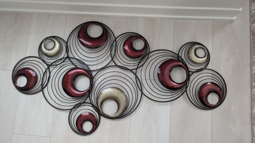 Metal wall decor with circles in shades of red and gold. Great for adding a modern touch to any room.