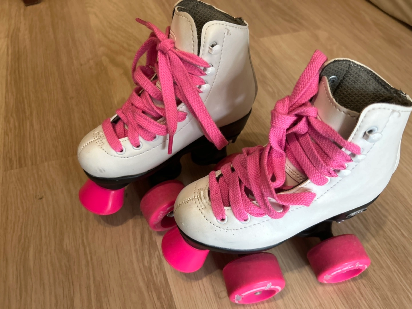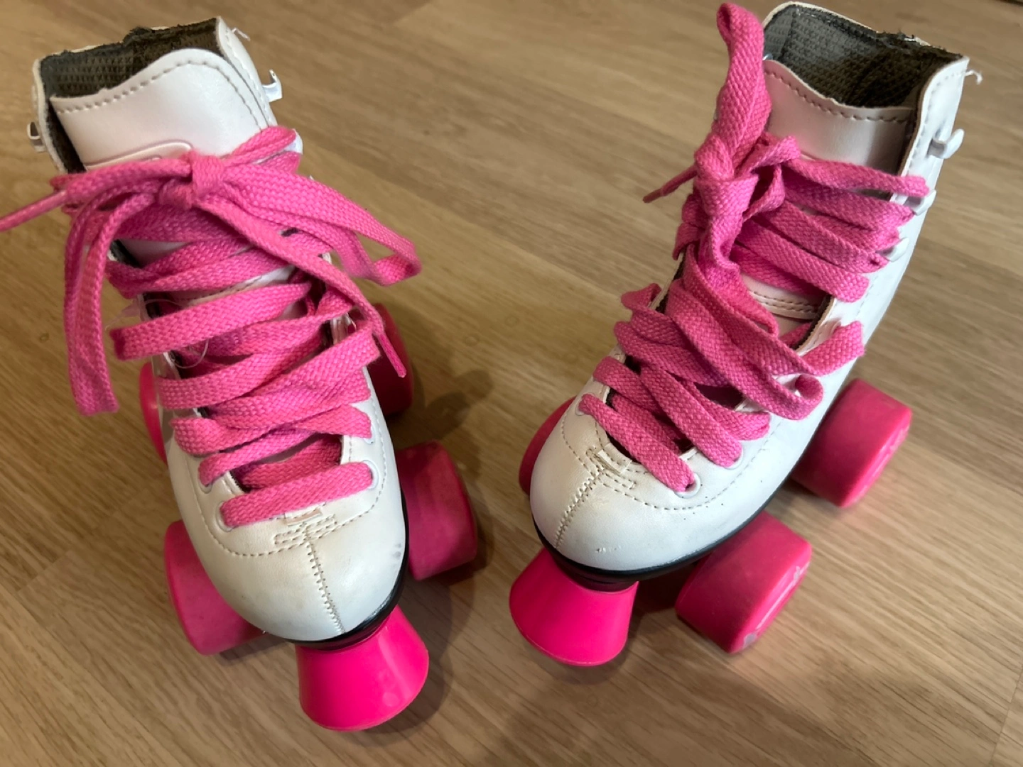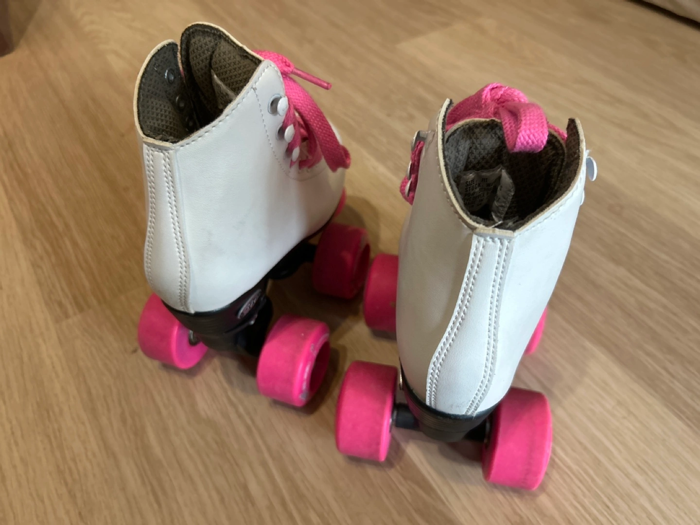 White roller skates with pink laces and wheels for child. Size J11 but brand fits on smaller side and boot is more narrow than other brands. Fits like a figure skate.