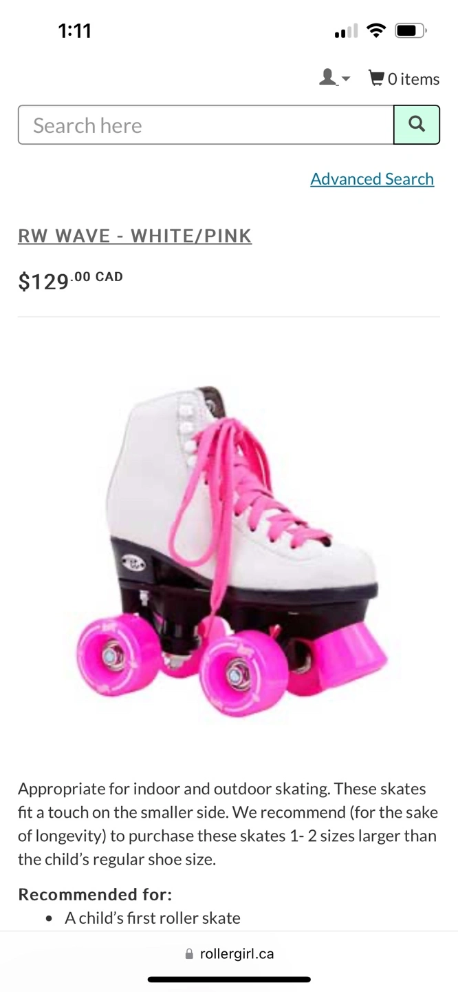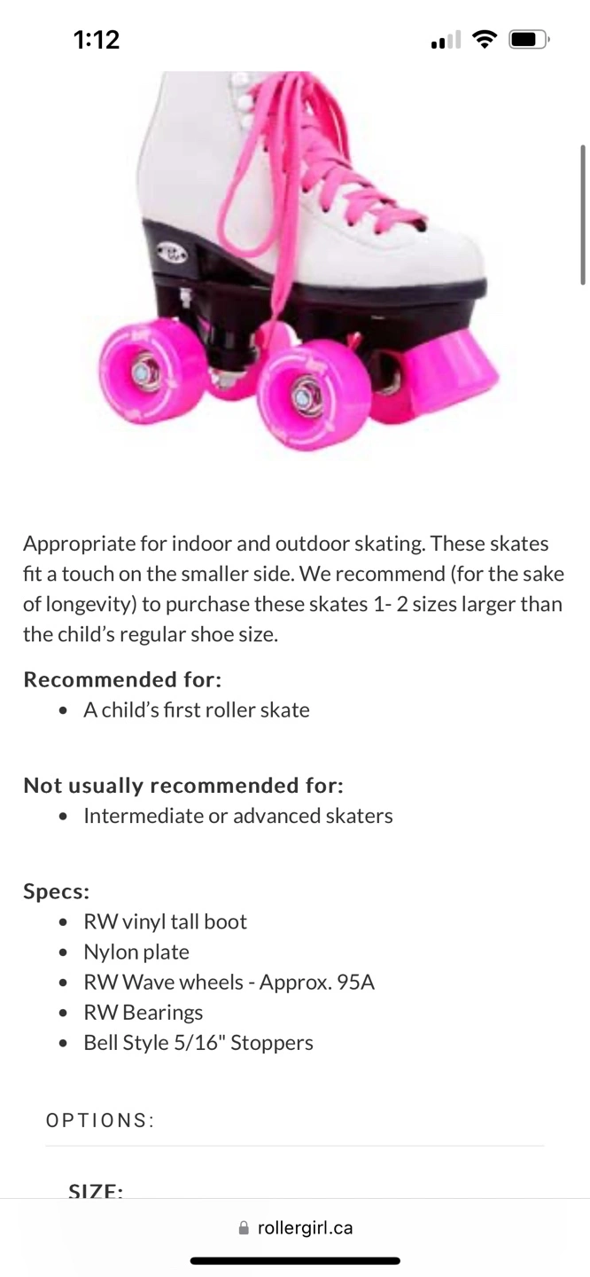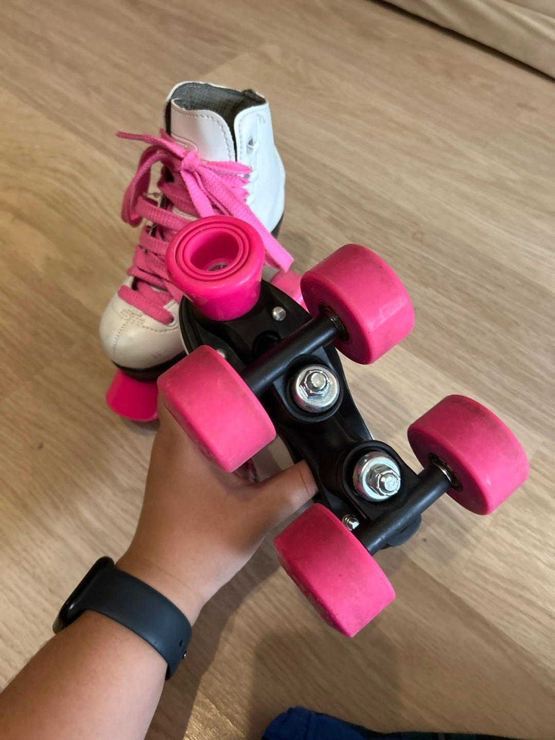 White roller skates with pink laces and wheels for child. Size J11 but brand fits on smaller side and boot is more narrow than other brands. Fits like a figure skate.