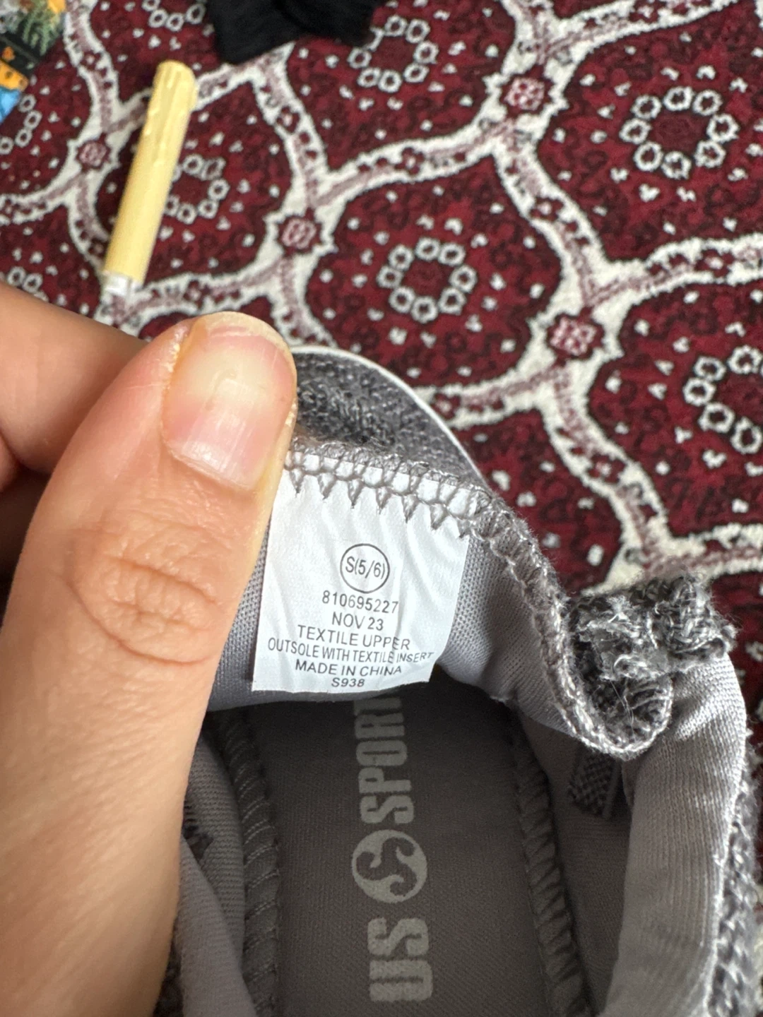 These US Sports toddler shoes are a size S (5/6). They feature a textile upper with a textile insert and rubber outsole. Made in China.