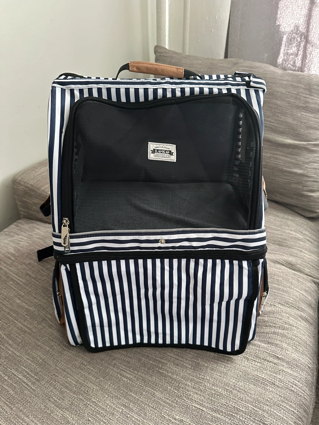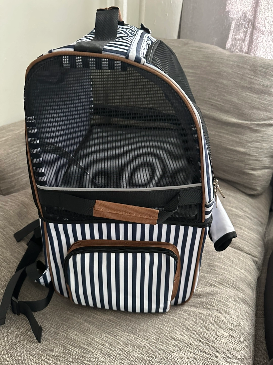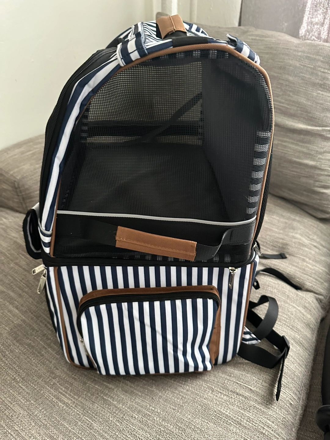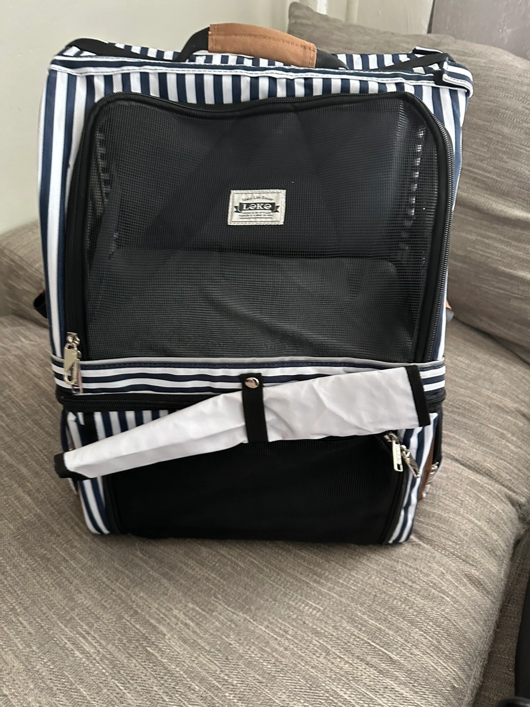Pet carrier for ( 2 small pups or cats)backpack with blue and white stripes. Features a mesh top and multiple pockets. 24lb limit.. back pack style used once .. pick up in East Harlem!