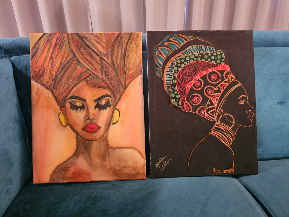 Two paintings on canvas, one with print and paint mixtures and one original painting. Both feature a woman with a headscarf. One is in a more realistic style, and the other has a more stylized look. both 12x16" inch #ThriftyPicks