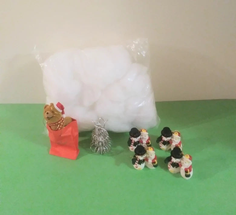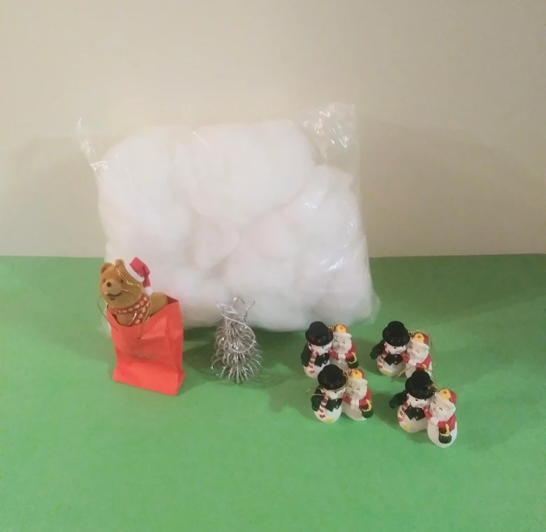 An assortment of 6 brand new, small, cute decorations - a Christmas teddy bear in a bag, Mr & Mrs Snowman and a shiny Christmas tree plus a small bundle of cotton wool, all for just $8, or $2 each.