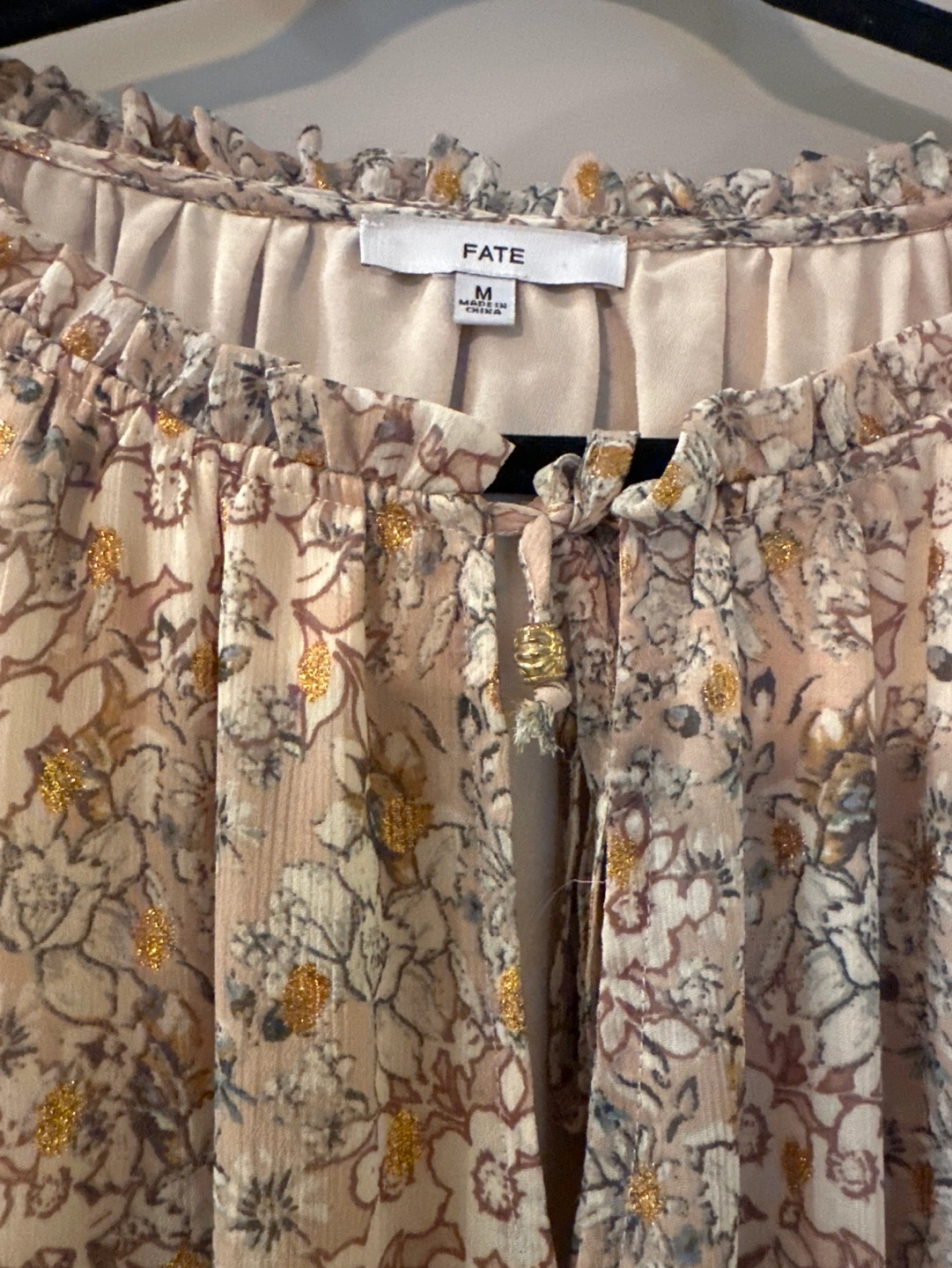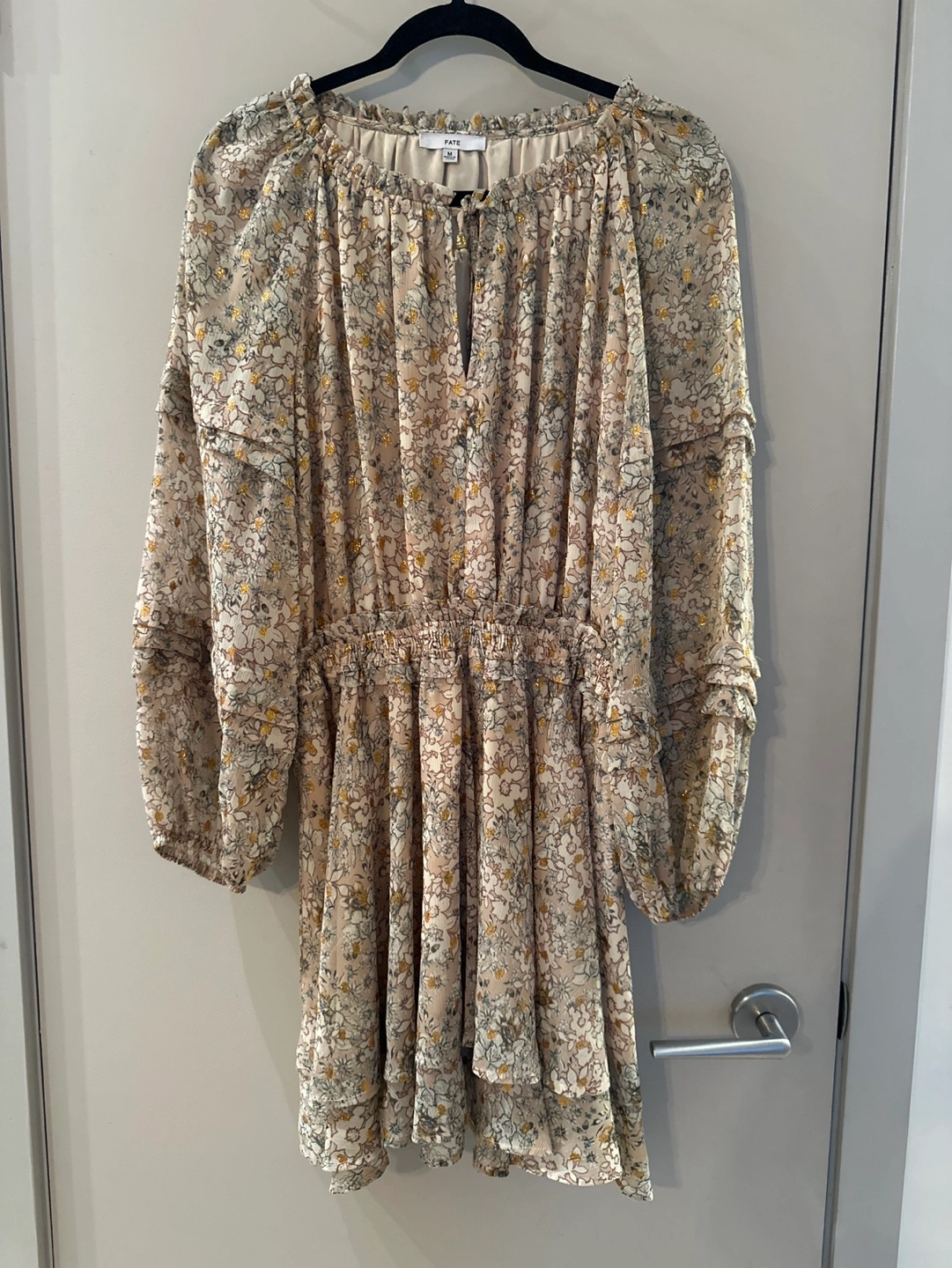 Floral print dress with long sleeves, a gathered waist, and a tie detail at the neckline. ( only wore once )