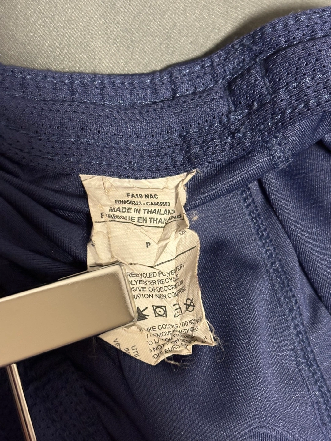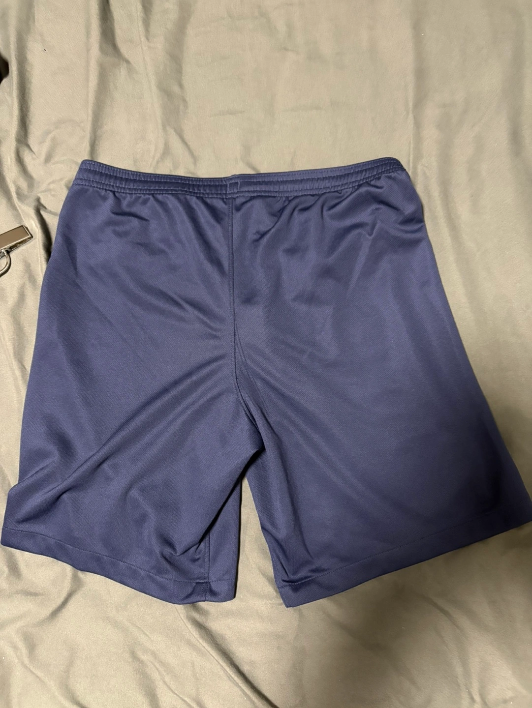Navy blue soccer shorts with the Paris Saint-Germain logo on the left leg and a Nike swoosh on the right leg. Elastic waistband with drawstring. Size small men’s