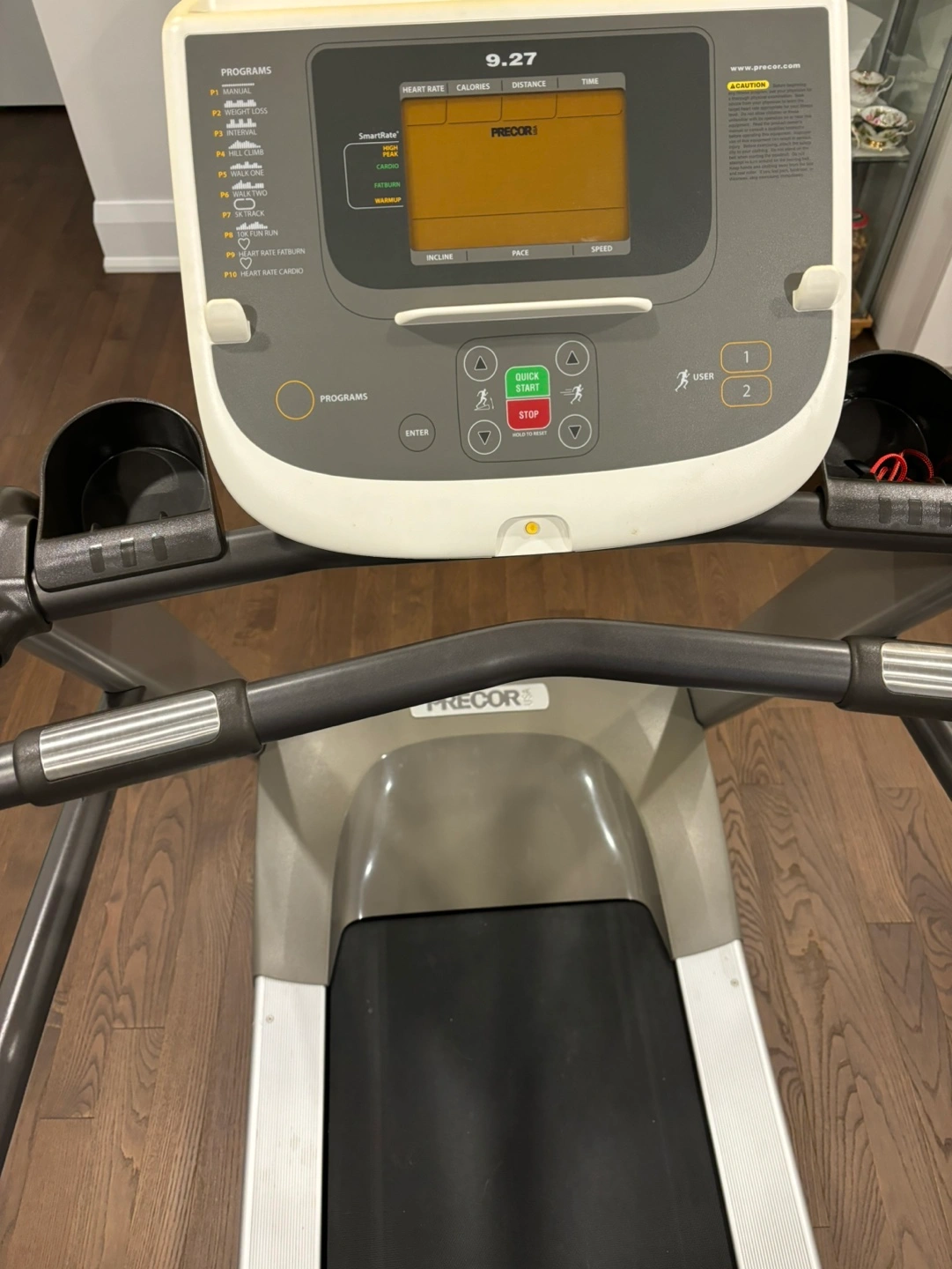 Precor treadmill, in good condition. Includes a variety of workout programs, incline, speed and heart rate monitoring features. Comes with a user manual.