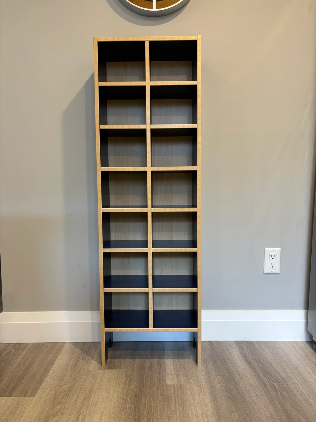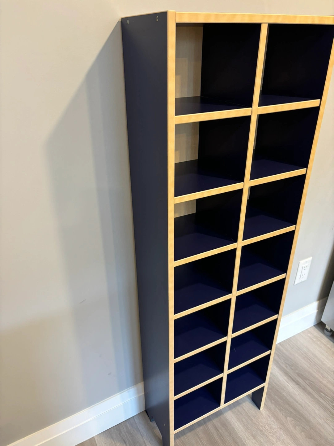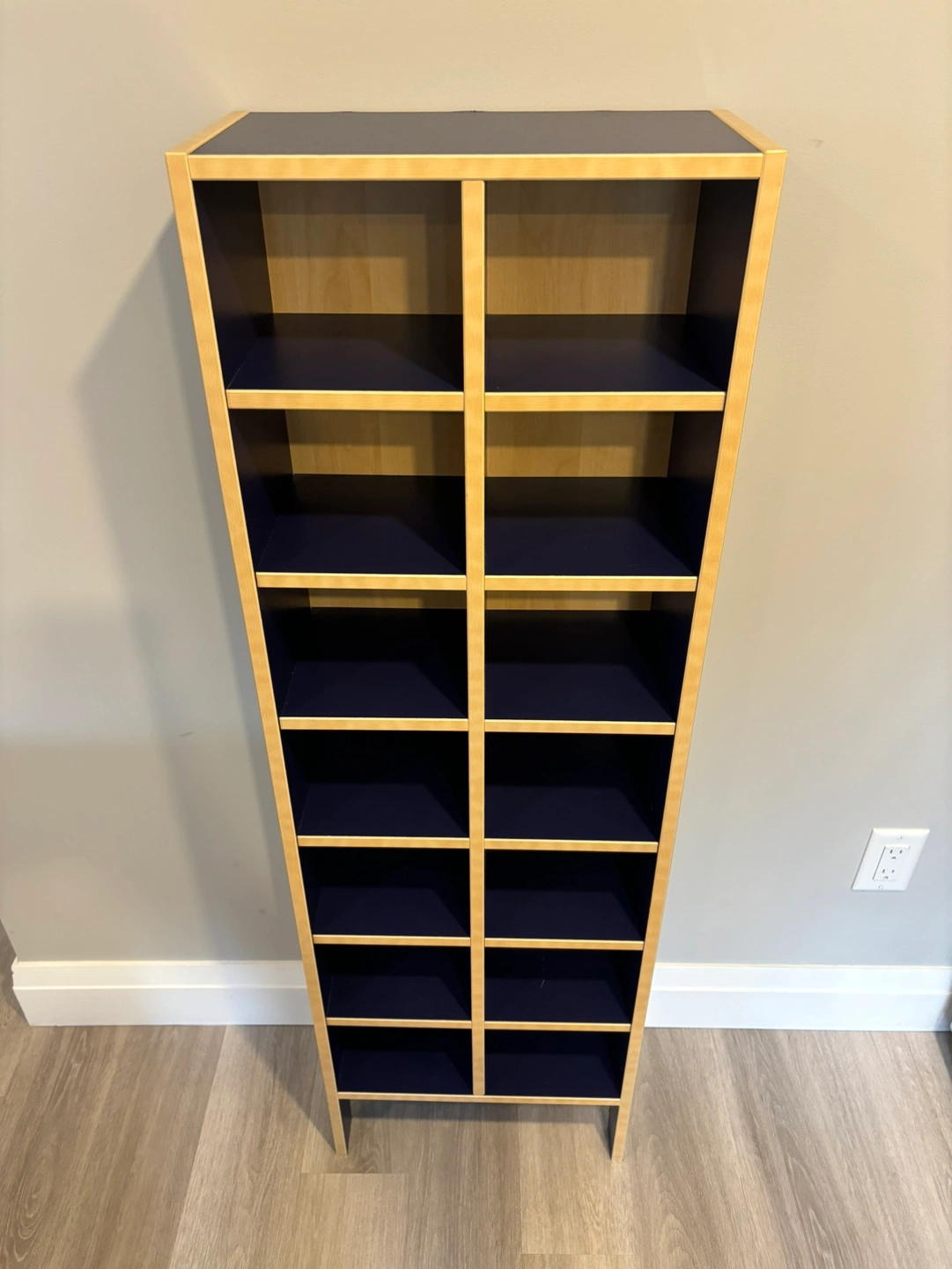 Tall shelving unit with 14 shelves. Perfect to store CDs. Blue with light wood trim. Some minor wear on the bottom of legs. In good used condition, from pet free/smoke free home. Shelves are not adjustable.