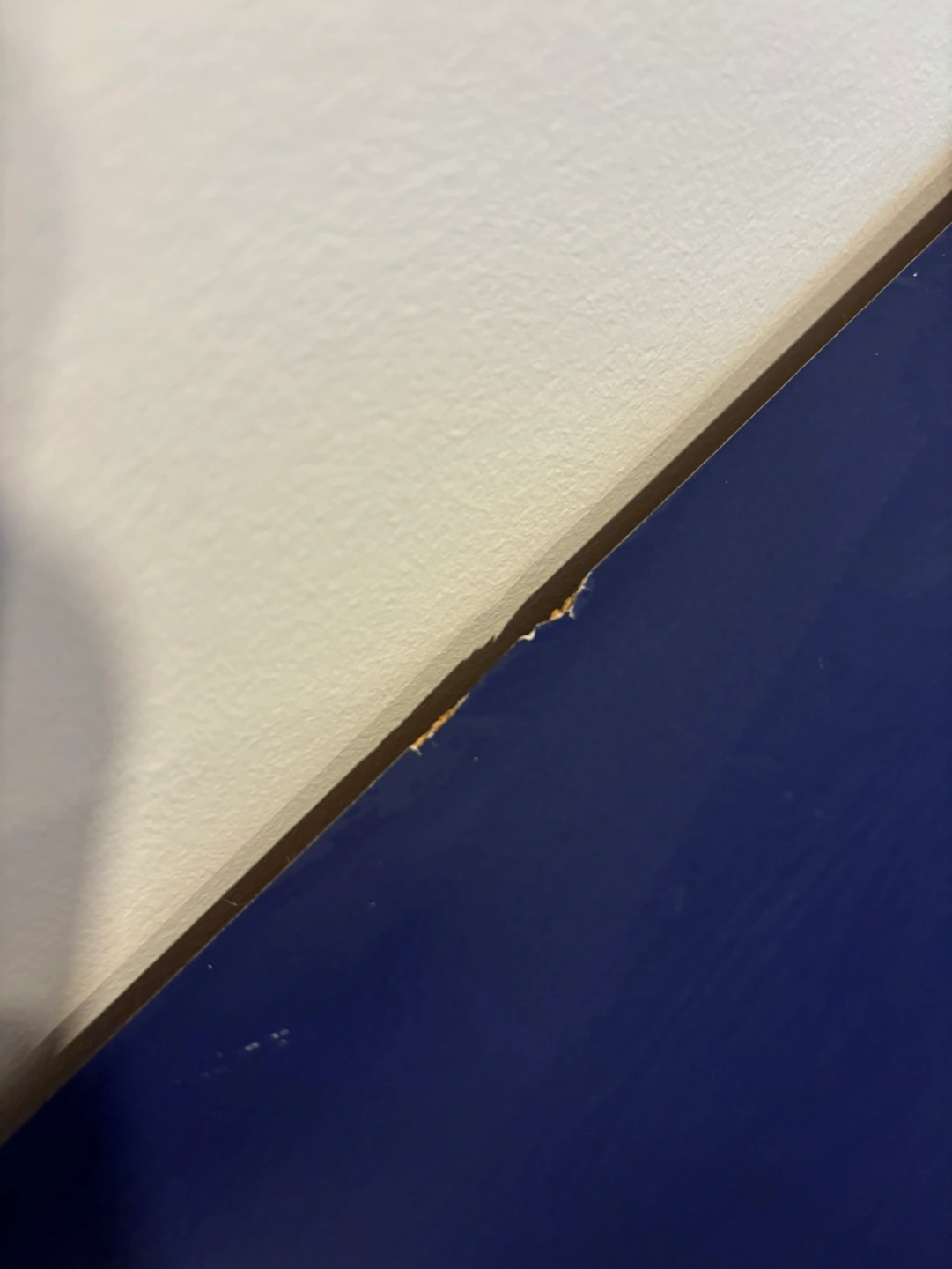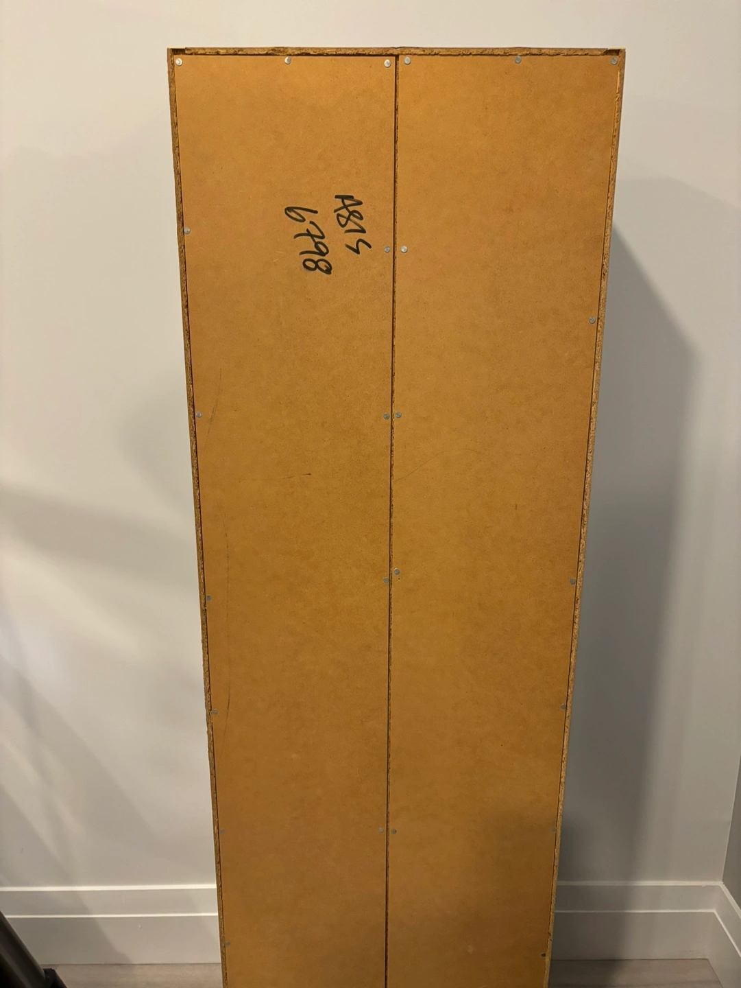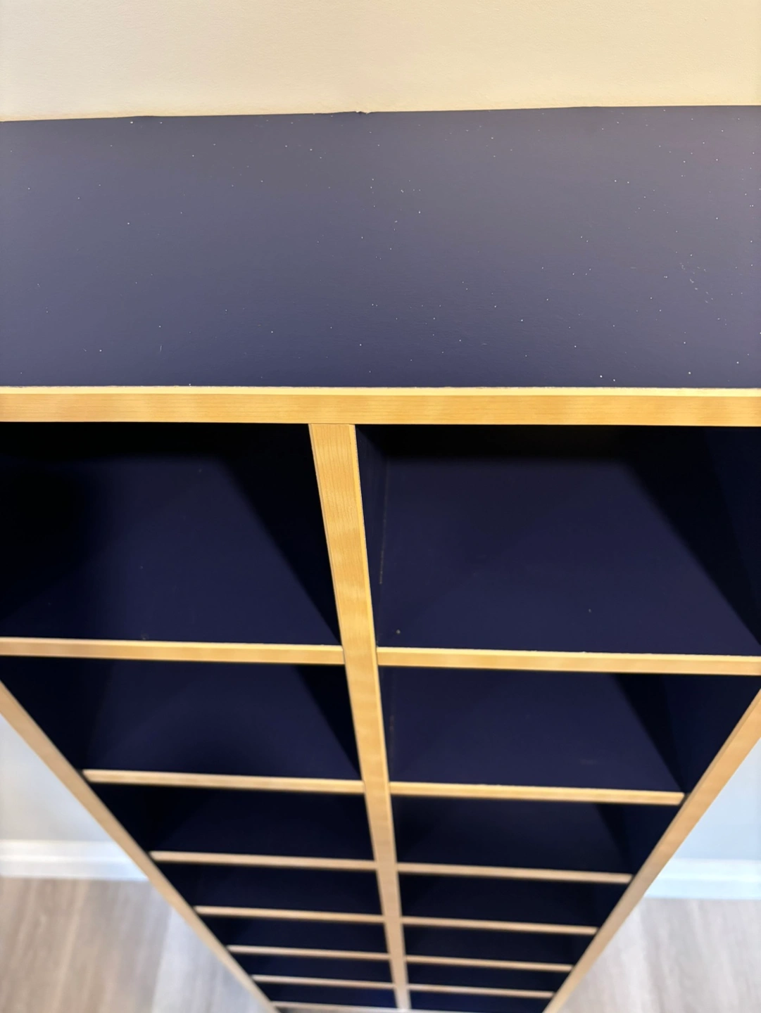 Tall shelving unit with 14 shelves. Perfect to store CDs. Blue with light wood trim. Some minor wear on the bottom of legs. In good used condition, from pet free/smoke free home. Shelves are not adjustable.