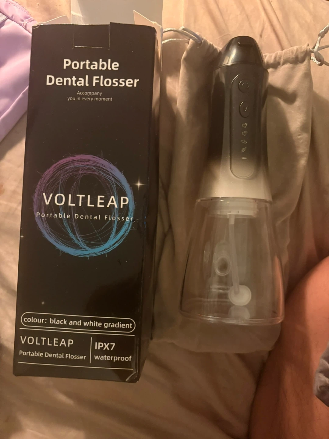 Portable dental flosser by VOLTLEAP. This unit is IPX7 waterproof and comes in a black and white gradient color. It's perfect for travel or on-the-go oral hygiene needs! Includes a storage pouch. Wellington and Halsted. Zelle or cash.
