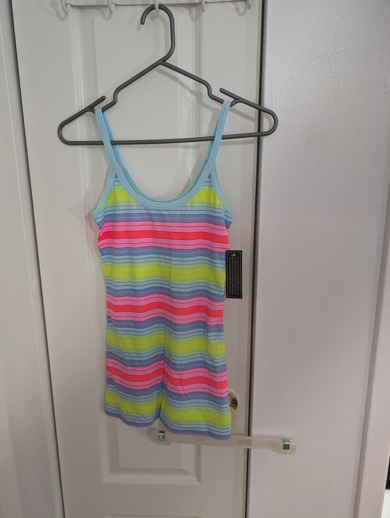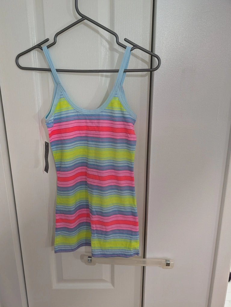 213Striped tank top, light blue, pink, green, and yellow stripes. Brand new with tag.