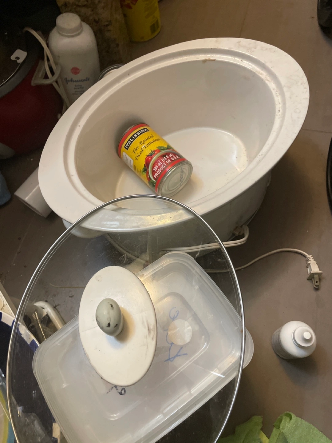 White slow cooker with glass lid, digital display, and multiple settings. Can Include a small food fridge containers / canned goods / fresh vegetables & fruits weekly discounted pickup or nearby delivery Mt. Pleasant/ downtown