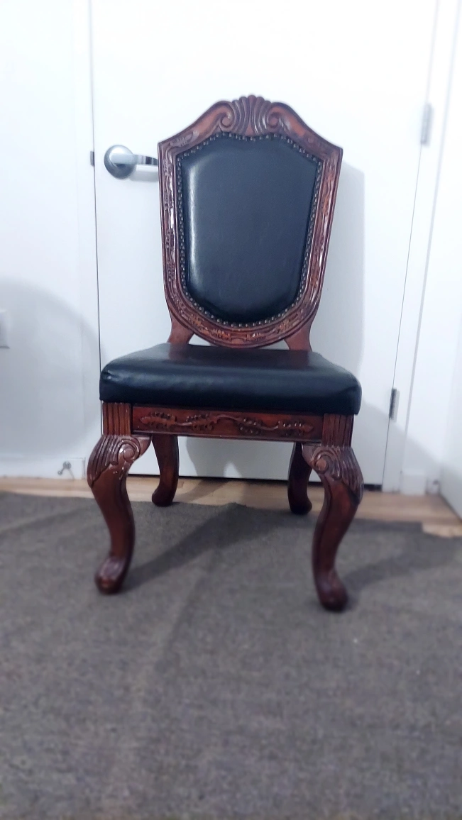 Elegant, carved wooden dining chair with black leather seat. Ornate details. Sturdy and comfortable.