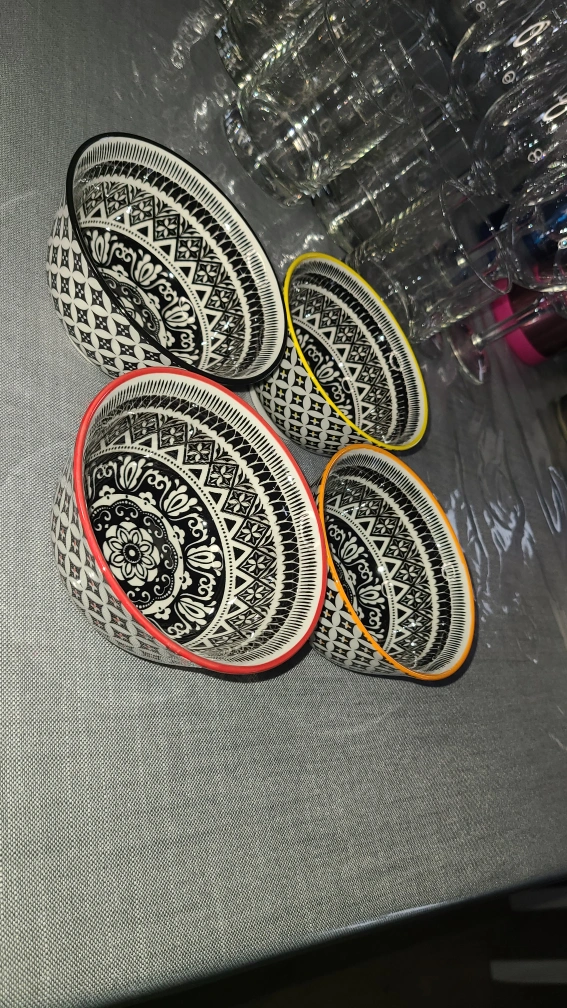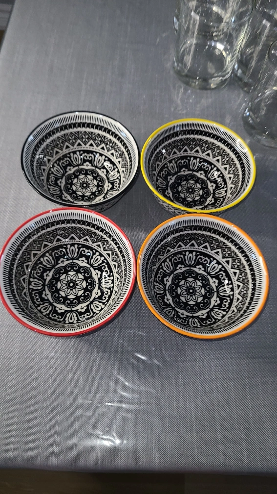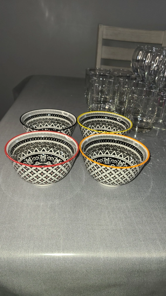 Set of four small bowls with black and white geometric patterns and coloured rims. They are in excellent condition.