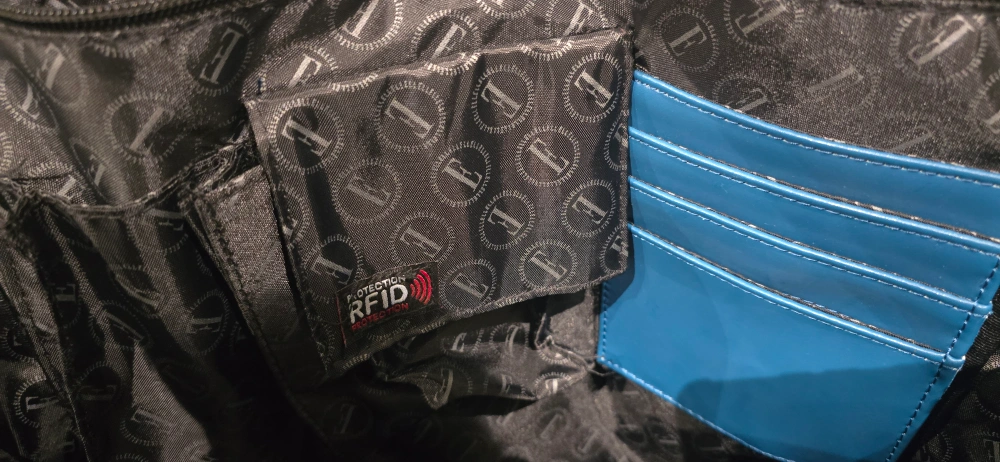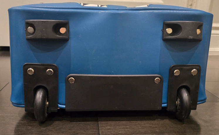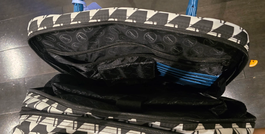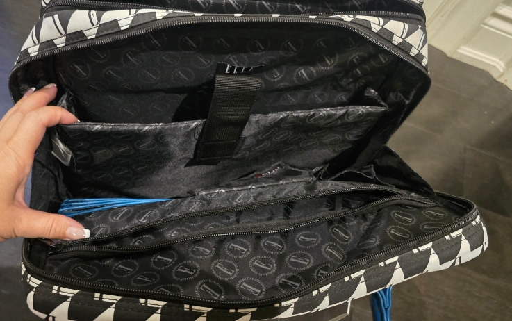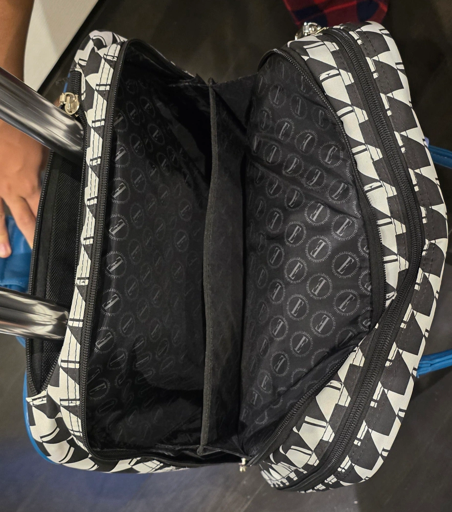 Rolling carry-on suitcase with multiple compartments for laptop, black and white patterned exterior, blue accents, and retractable handle.