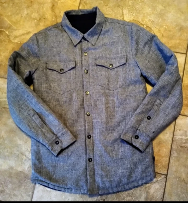Reversible men's insulated shirt jacket is made with Thinsulate for extra warmth. One side is gray with two top pockets and the other side is black and quilted with two side pockets. Has snap closures down front.