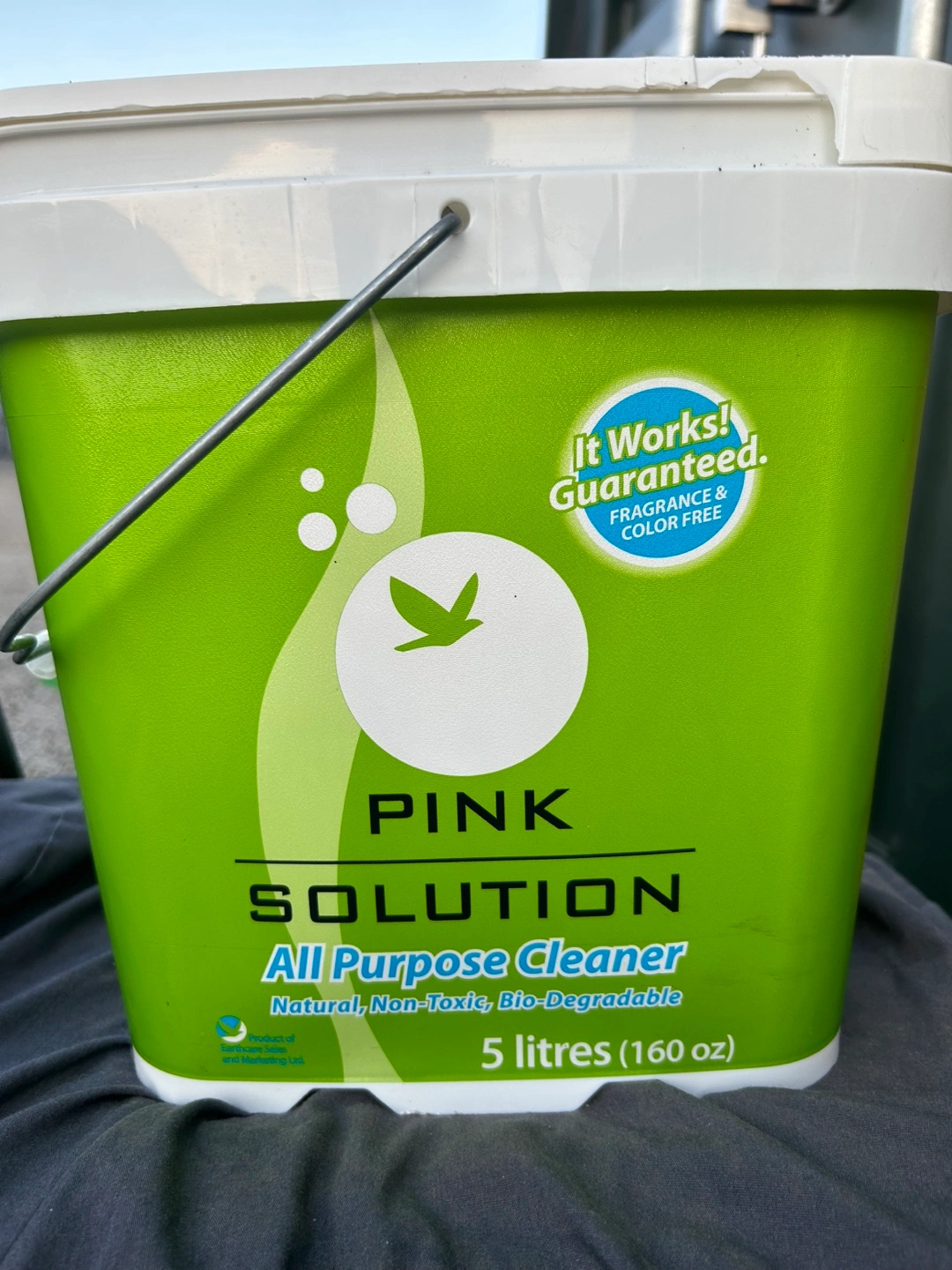 5 Litre (160 oz) bottle of Pink Solution All Purpose Cleaner. Natural, non-toxic, and biodegradable. Includes a 500 mL bottle of Multi-Purpose Cleaner, a large bathroom sponge, a kitchen scrubber, and a laundry bar.